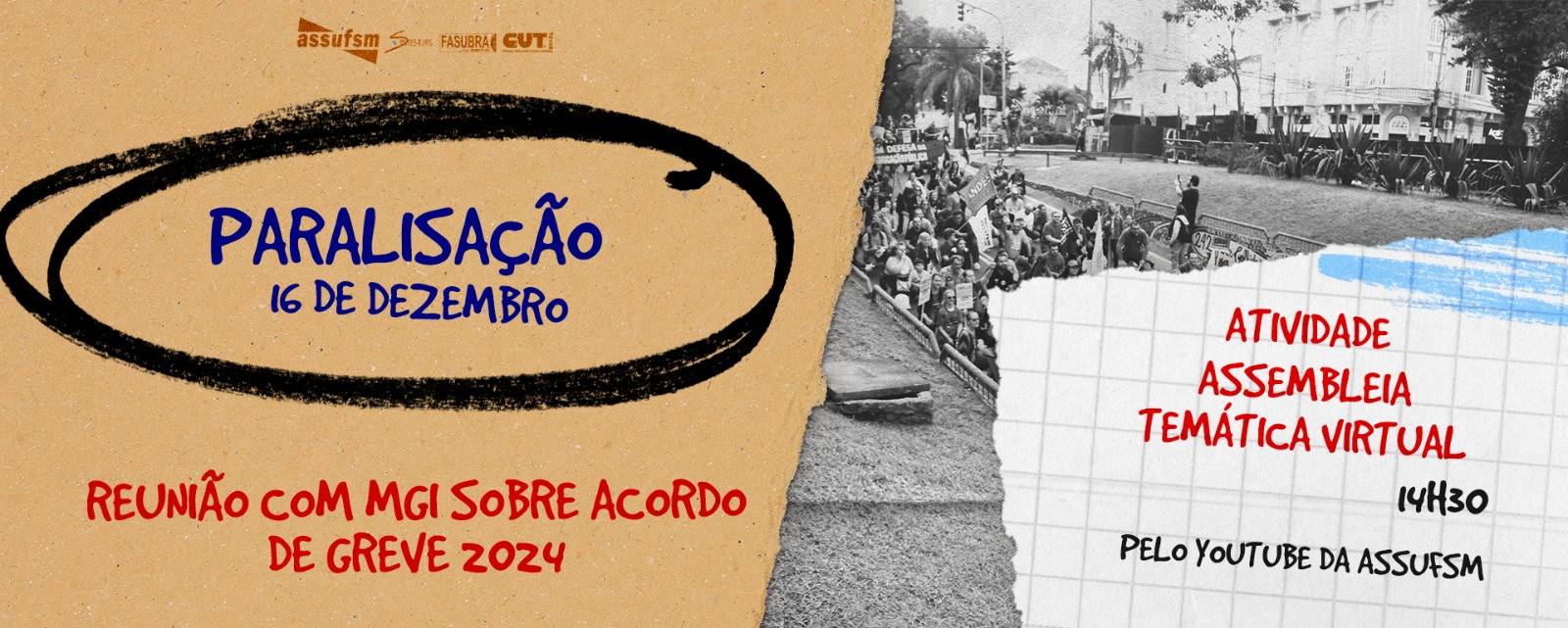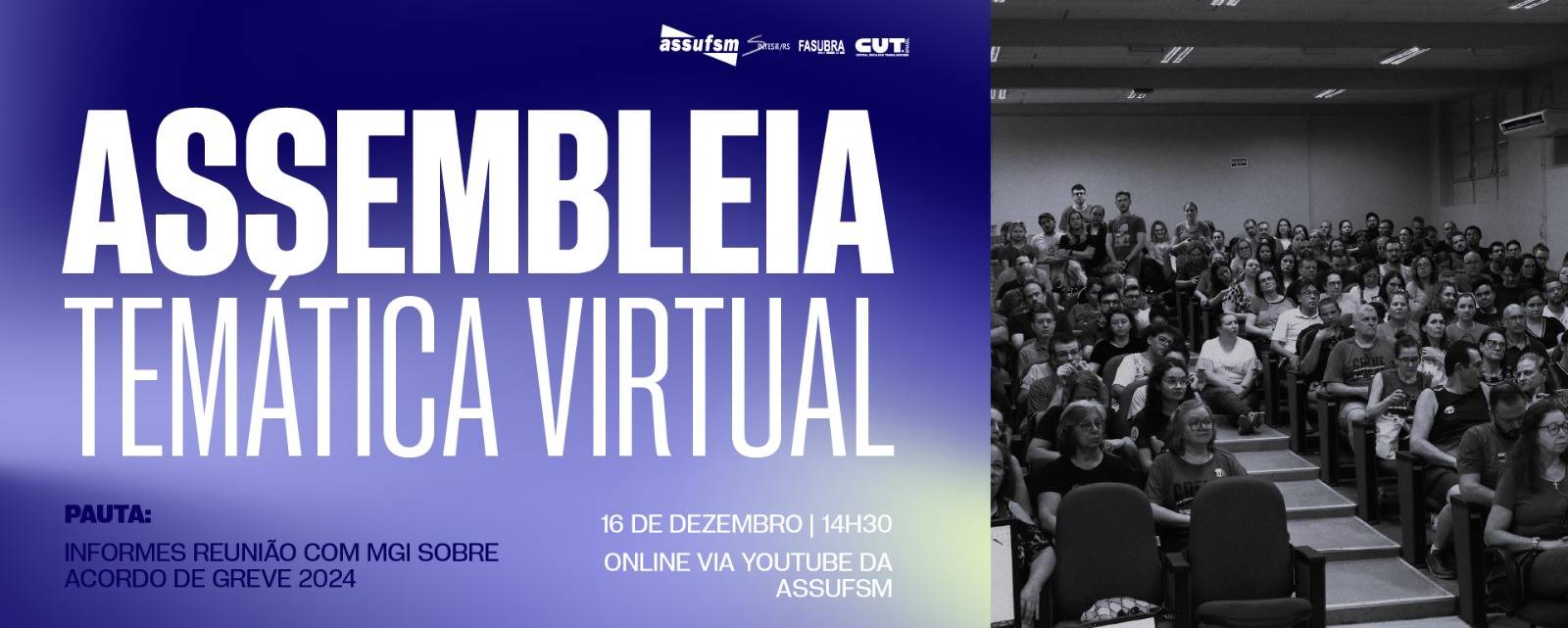 📢 A Assufsm chama a categoria para participar de Assembleia Temática Virtual, na terça-feira, dia 16 de dezembro, às 14h30, de maneira virtual, com transmissão pelo YouTube da
