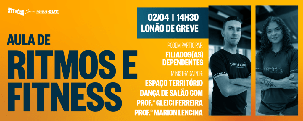 A Assufsm informa que, em função do feriado, a aula de Ritmos Fitness da Sede Campestre foi transferida. Nesta semana a aula será realizada na quinta feira, 02, às 14h30, no lonão da greve, em frente ao INPE. TAE, participe!