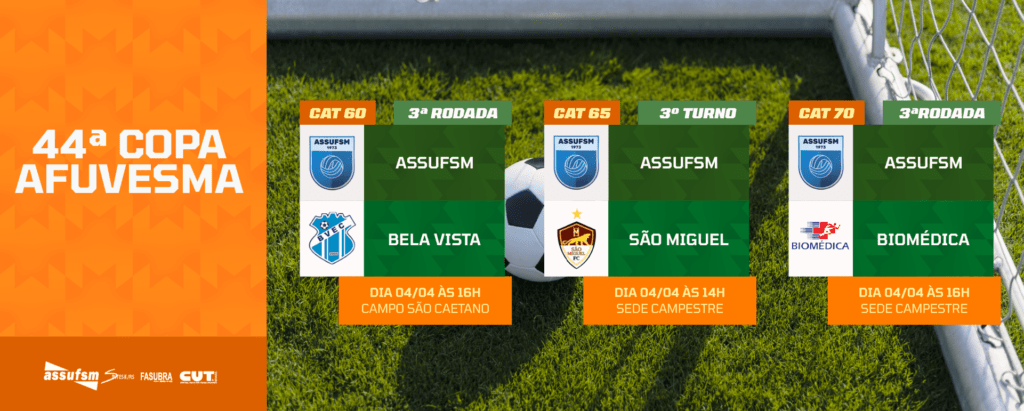 ⚽ Os times da Assufsm entram em campo no sábado, dia 04 de abril, pela Copa AFUVESMA, com partidas na Sede Campestre. 🏆 CATEGORIA 60 Anos – 3ª RODADA 🕑 HORA: 16h 📍 LOCAL: Campo São Caetano/PTropas ASSUFSM X BELA VISTA 🏆 CATEGORIA 65 Anos – 3° Rodada 🕑 HORA: 14:00 📍LOCAL: Sede Campestre ASSUFSM […]