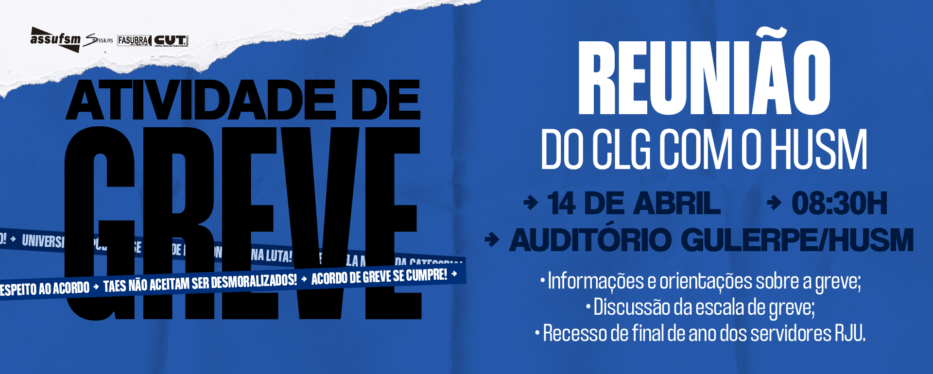 AGENDA DE GREVE DA SEMANA (13 a 17/04) ➡️ 13/04 – 9h – Reunião do CLG no lonão ➡️ 14/04 – 8h –