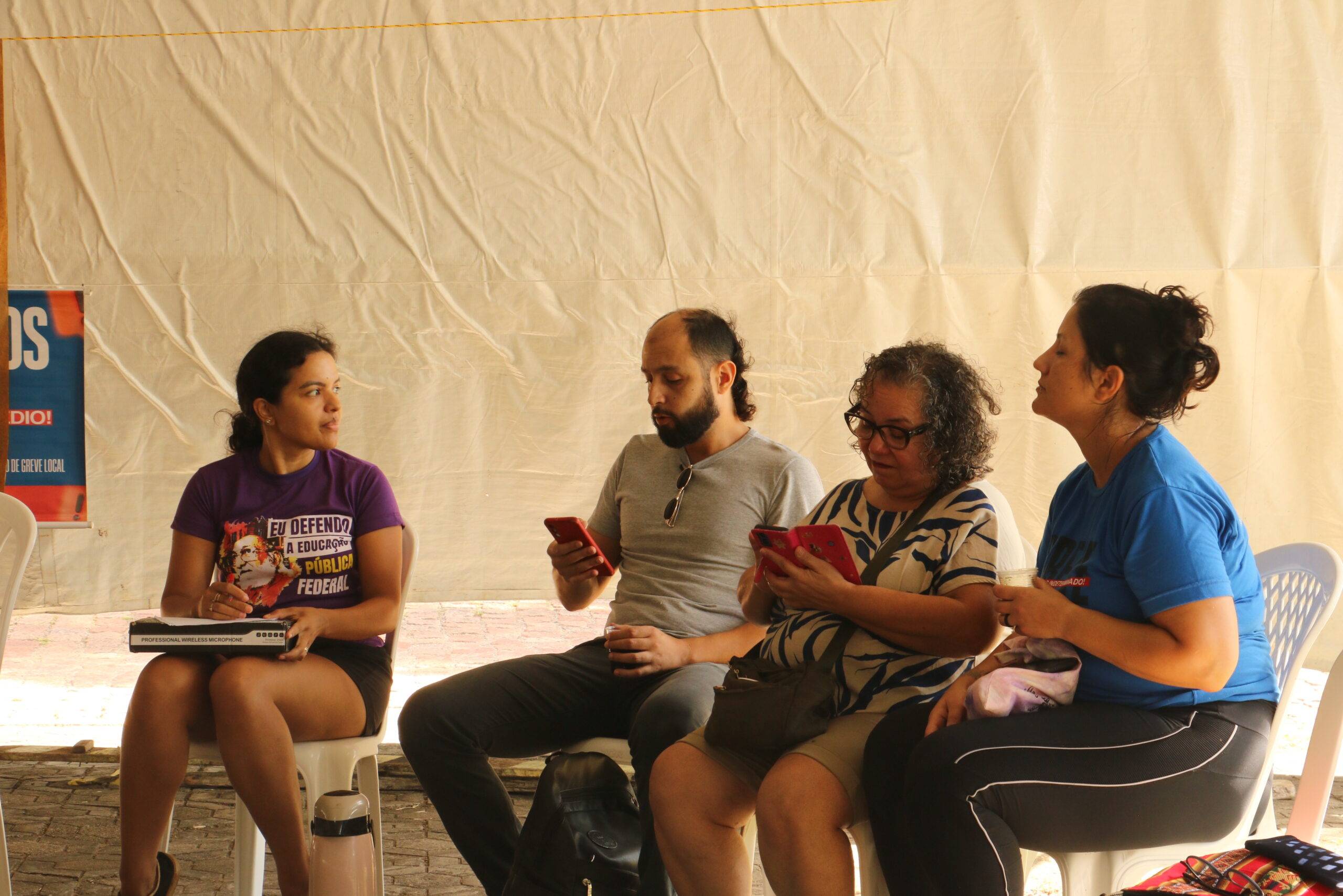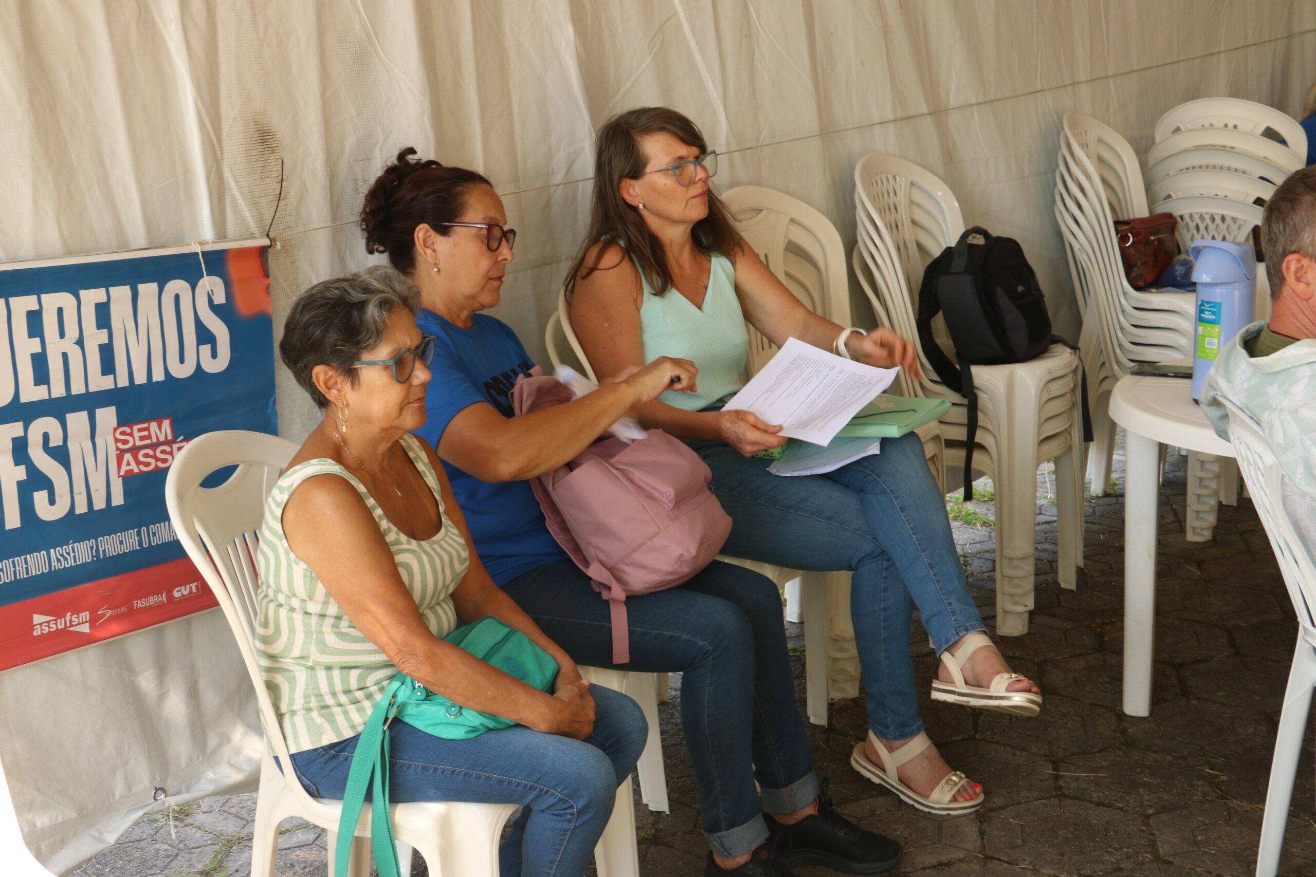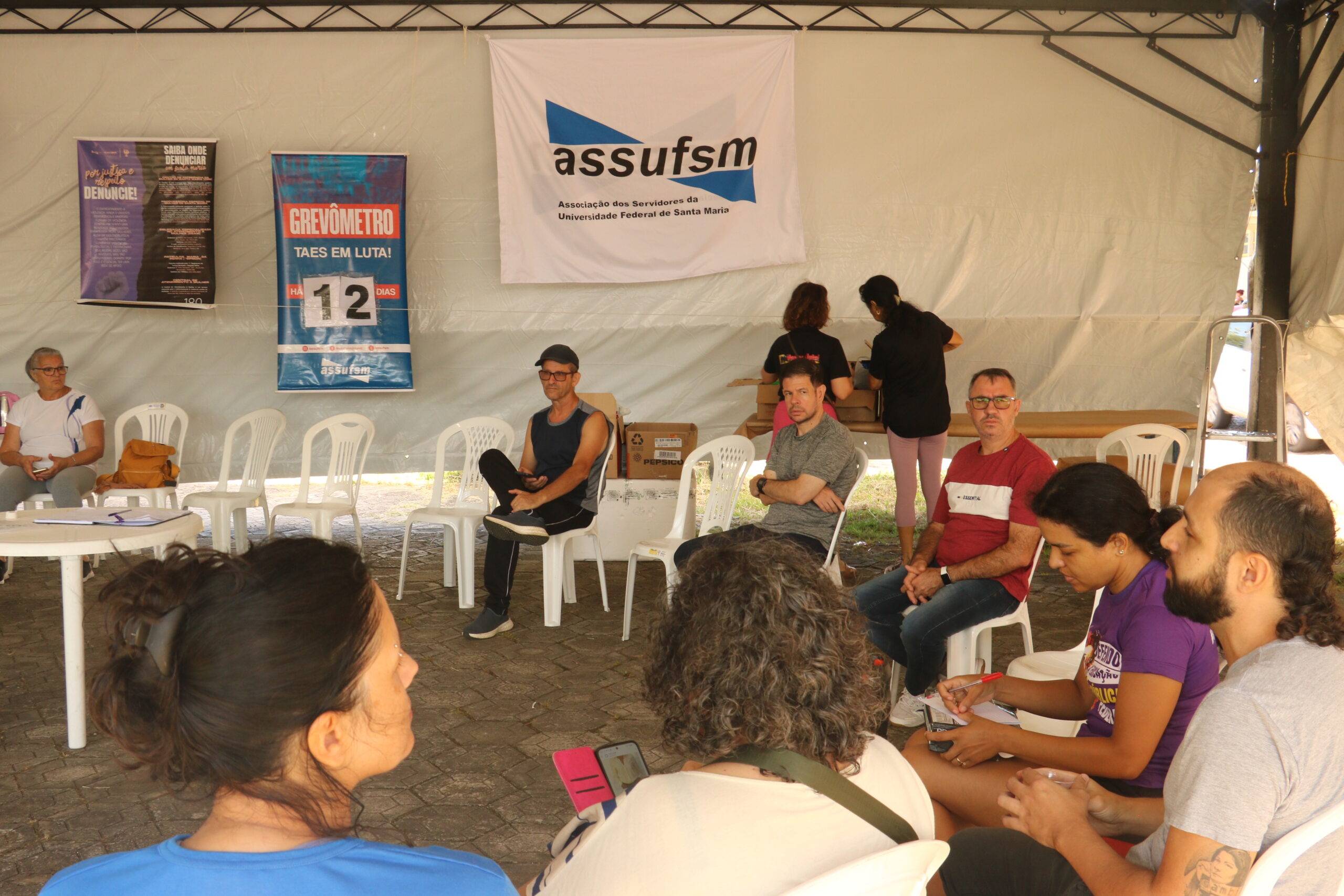 Nesta sexta-feira (06), no 12º dia de greve das e dos Técnico-Administrativos em Educação da UFSM, as comissões de greve se reuniram no lonão da greve para discutir e organizar as próximas atividades de mobilização do movimento.