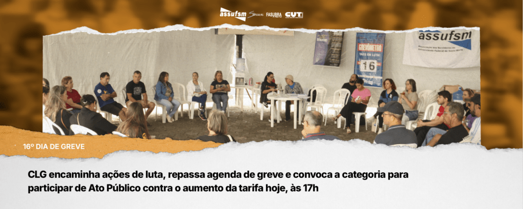 Além disso, o lonão recebeu representantes do DCE que passaram informes sobre o movimento organizado pelo diretório na tarde dessa terça-feira (10), às 17h, na Praça Saldanha Marinho. O CLG convoca a categoria TAE a somar-se no movimento estudantil para barrar o aumento da tarifa de transporte público de Santa Maria, a terceira mais cara do estado do Rio Grande do Sul, com R$ 7,25. O DCE também agradeceu o apoio financeiro da Assufsm, que contará com a parte de sonorização no ato de hoje.
