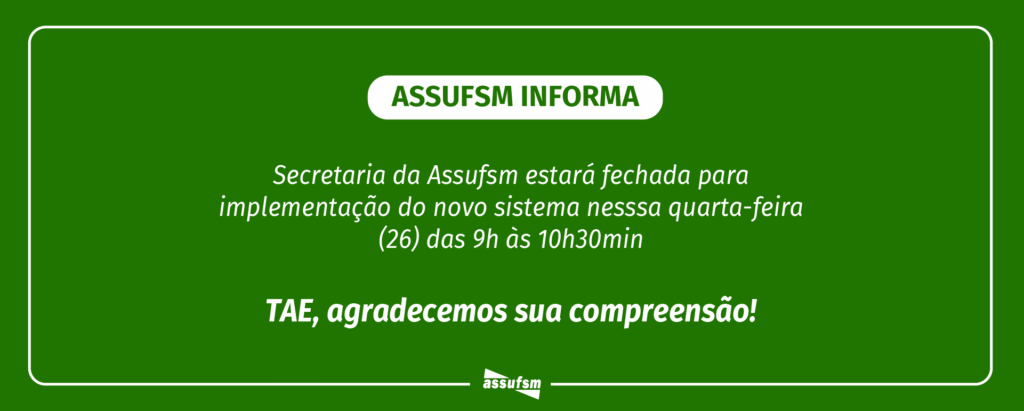 ATENÇÃO, TAE! Das 9h às 10h30 desta quarta-feira (26), a Secretaria estará fechada para implementação do novo sistema. O expediente retorna ao normal logo após, funcionando até às 11h30min e das 12h30min às 16h. Contamos com a sua compreensão, TAE!