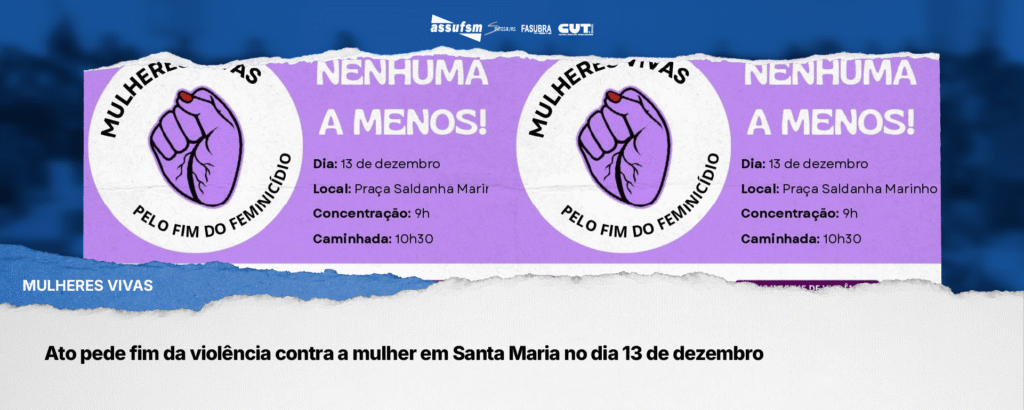 O Levante Mulheres Vivas vai realizar um ato, em Santa Maria, em resposta à epidemia de violência contra as mulheres que assola o país. No dia 13 de dezembro, a partir das 9h, a Praça Saldanha Marinho será ocupada para afirmar, sem medo e sem recuo que a vida das mulheres precisa ser prioridade agora. […]