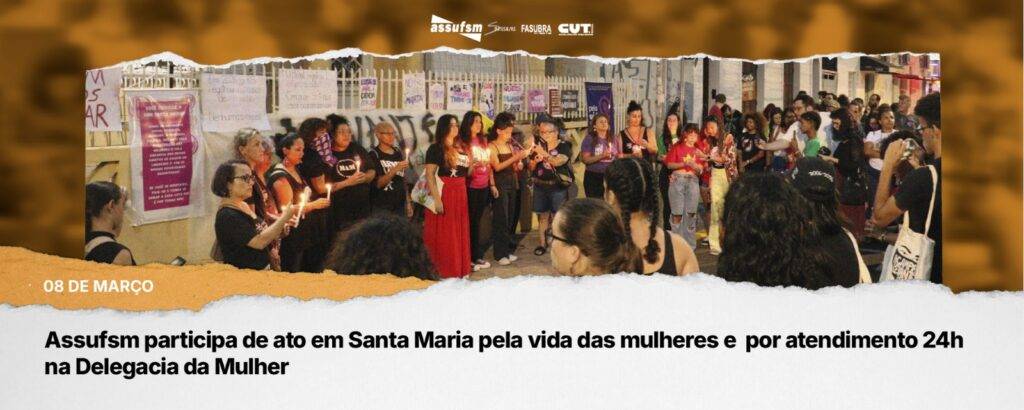 Neste domingo (08), Dia Internacional da Mulher, a Assufsm se somou a movimentos sociais, coletivos feministas e entidades da Educação em um ato público realizado em Santa Maria. A mobilização iniciou na Praça Saldanha Marinho e seguiu em marcha até a Delegacia Especializada no Atendimento à Mulher de Santa Maria, na rua Duque de Caxias, […]