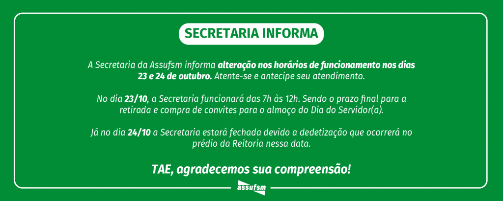 A Secretaria da Assufsm informa que haverá mudança no horário de funcionamento nos dias 23 e 24 de outubro.