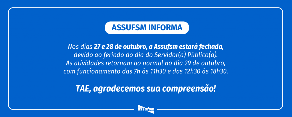 Nos dias 27 e 28 de outubro, a Assufsm estará fechada, devido ao feriado do dia do Servidor(a) Público(a).