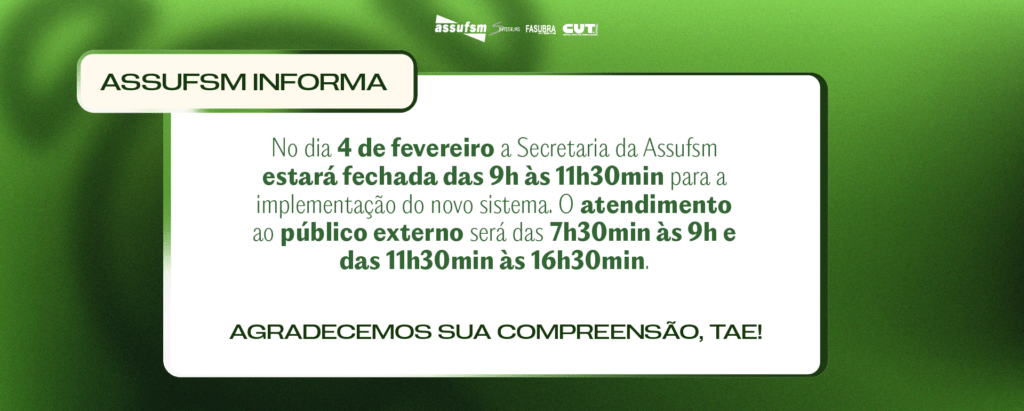 No dia 4 de fevereiro a Secretaria da Assufsm estará fechada das 9h às 11h30min para a implementação do novo sistema. O atendimento ao público externo será das 7h30min às 9h e das 11h30min às 16h30min.