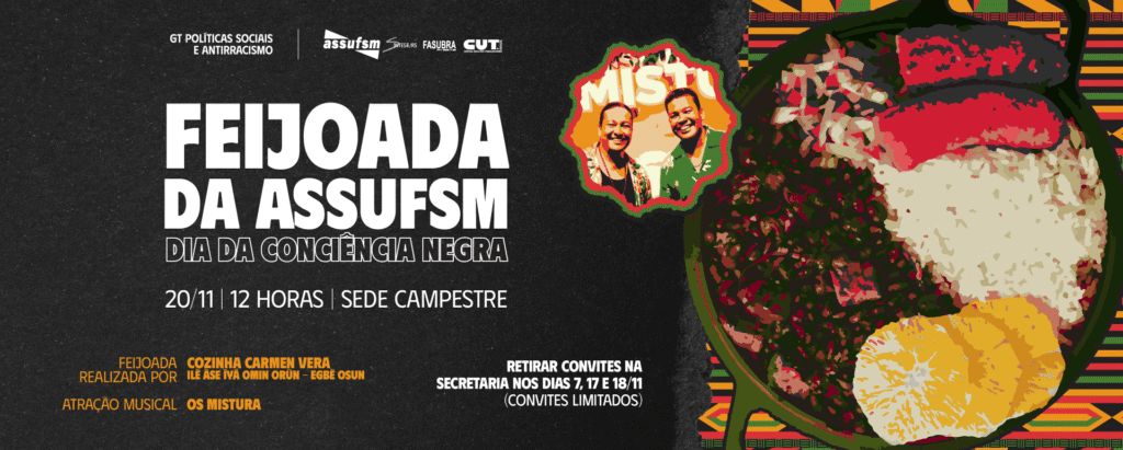 No dia 20 de novembro, às 12h, na Sede Campestre da Assufsm, será servida a tradicional feijoada em alusão ao Dia da Consciência Negra, feriado em todo o território nacional.