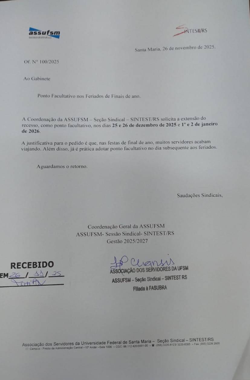 Após a divulgação da notícia da UFSM, sobre as normas para Servidores(as) Públicos(as) para o recesso de final de ano 2025 (confira aqui), a Assufsm, representada pela Coordenadora Geral Loiva Chansis, foi até o Gabinete do Reitor Luciano Schuch, entregar em mãos o ofício 100/2025 pedindo que os dias 25 e 26 de dezembro e 1º e 2 de janeiro tenham ponto facultativo.