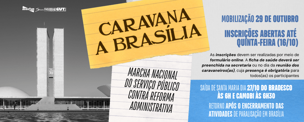 📢 Um dos encaminhamentos da Assembleia Geral da ASSUFSM, realizada na tarde do dia 8 de outubro, foi a organização de uma caravana a Brasília, para que a categoria TAE possa se somar às atividades da Marcha Nacional do Serviço Público contra a Reforma Administrativa, no dia 29 de outubro. ➡️ As inscrições para a […]