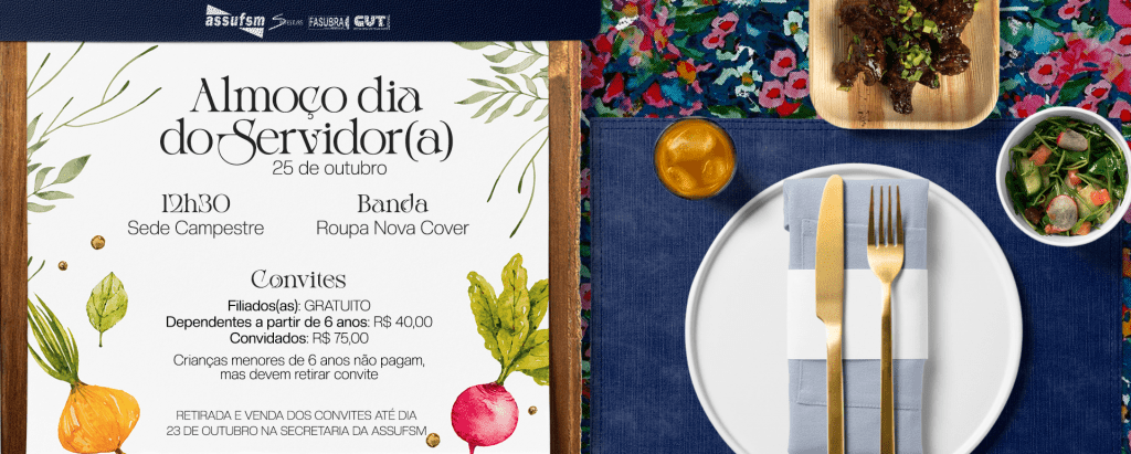 Em comemoração ao Dia do(a) Servidor(a) Público(a), a Assufsm convida seus filiados e filiadas, dependentes e convidados(as) a participarem do almoço dançante do(a) Servidor(a). Neste ano, a comemoração será no dia *25 de outubro, a partir das 12h30min, na Sede Campestre da Assufsm*, na Rua da ABS, no Bairro Lorenzi. A animação do almoço fica […]