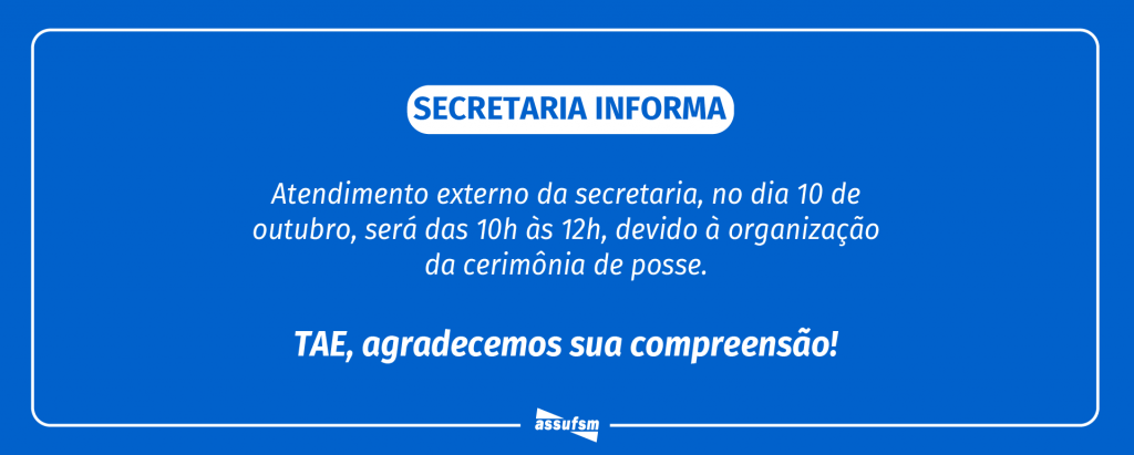 Atenção TAE, a Secretaria da Assufsm terá horário diferenciado na sexta-feira, 10 de outubro, devido a organização da Cerimônia de Posse da gestão Assufsm 2025/2027, funcionando externamente das 10h às 12h, por tanto, antecipe seu atendimento. A cerimônia de posse ocorrerá na sexta-feira (10), às 15h, no Salão Imembuí, no segundo andar do prédio da […]