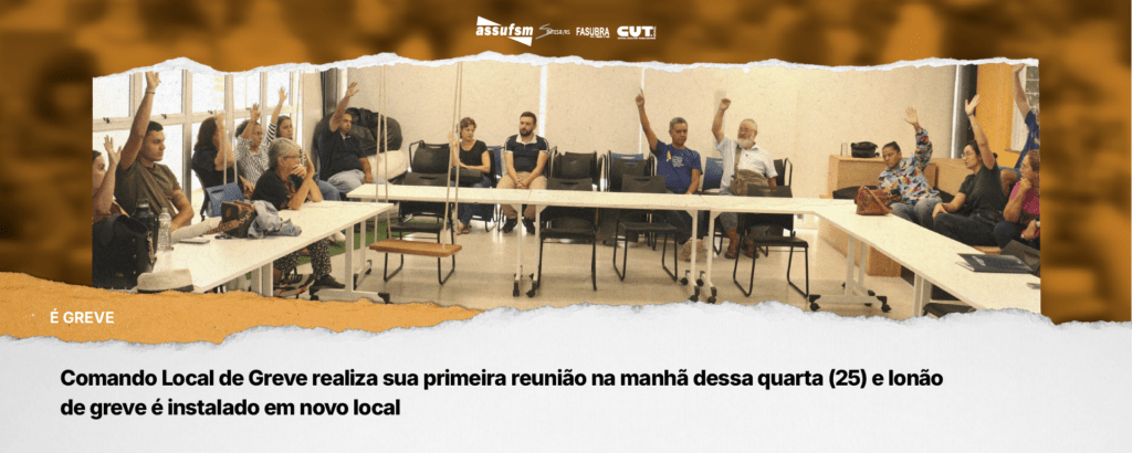 Na manhã dessa quarta-feira (25), o Comando Local de Greve da Assufsm (CLG) realizou sua primeira reunião com a base sindical para dar início à construção da greve de 2026. Dentre os debates, a categoria de TAEs demonstrou revolta com o local que o tradicional lonão de greve seria instalado, argumentando que o estacionamento da […]