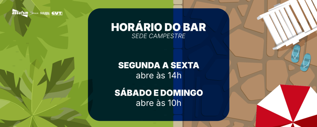A Assufsm informa os novos horários de funcionamento do bar na Sede Campestre. Programe-se para aproveitar nossa estrutura de lazer: Segunda a Sexta: das 14h em diante. Sábado e Domingo: das 10h em diante. Aproveite o verão com mais comodidade e venha desfrutar da nossa sede!