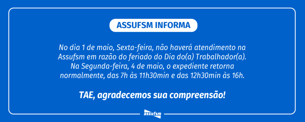 O Comando Local de Greve convoca as servidoras e servidores Técnico Administrativos em Educação para participarem da próxima Assembleia Temática de Greve, que será realizada no dia 29 de abril, às 9h, no Auditório Flávio Miguel Schneider, no Centro de Ciências Rurais (CCR). O encontro terá como pauta central a racionalização dos cargos. TAE, participe! […]