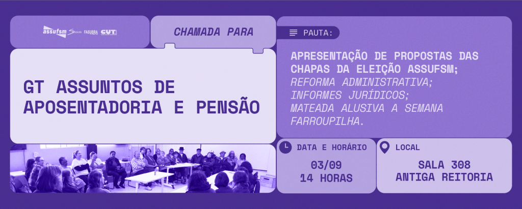 O próximo encontro do GT Aposentadoria e Pensão será, como de costume, na primeira quarta-feira do mês, dia 03 de setembro, na Antiga Reitoria, na sala 308.Será um momento importante de discussão e atualização sobre a mobilização contra a Reforma Administrativa. O advogado Heverton Padilha, do escritório Wagner Advogados Associados, também estará presente trazendo informes jurídicos […]