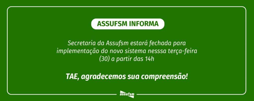 ATENÇÃO, TAE! A partir das 14h desta terça-feira (30), a Secretaria estará fechada para implementação do novo sistema. Na quarta-feira (1º/10), a Secretaria retorna com horário normal de atendimento ao público, com expediente das 7h às 11h30min e das 12h30min às 18h30min. Contamos com a sua compreensão, TAE!