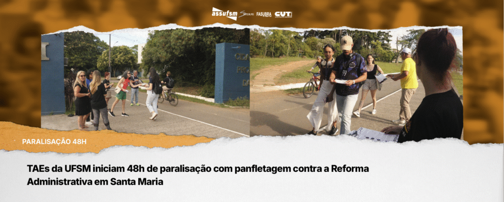 A manhã desta quarta-feira (03) começou movimentada no campus da UFSM, com a realização da primeira atividade da paralisação nacional de 48 horas convocada pela Fasubra. A ação, organizada pela Assufsm e com participação ativa da Sedufsm, marcou o início das mobilizações locais contra a Reforma Administrativa (PEC 38), proposta que voltou ao centro do […]