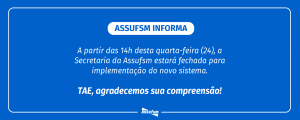 ATENÇÃO, TAE! A partir das 14h desta quarta-feira (24), a Secretaria estará fechada para implementação do novo sistema. Amanhã, quinta-feira (25), a Secretaria retorna com