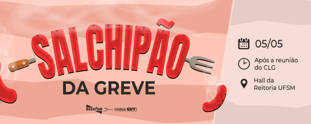 O Comando Local de Greve (CLG) convida a categoria TAE para o Salchipão da Greve, que acontece no Hall da Reitoria, em ato sincronizado com o Comando Nacional de Greve (CNG). A atividade terá início após a reunião do CLG, que será realizada todas as terças-feiras, no hall da Reitoria, às 9h.
