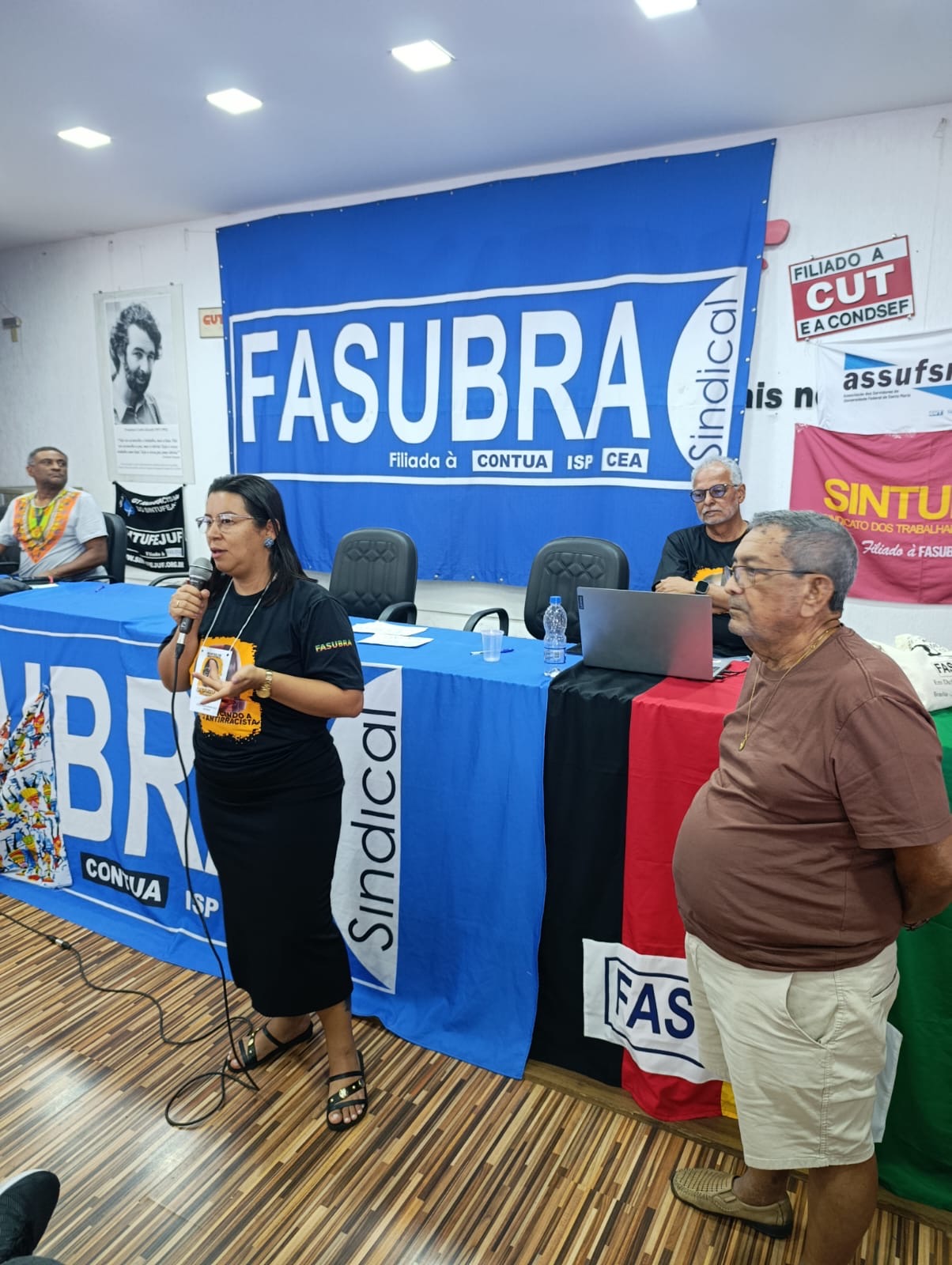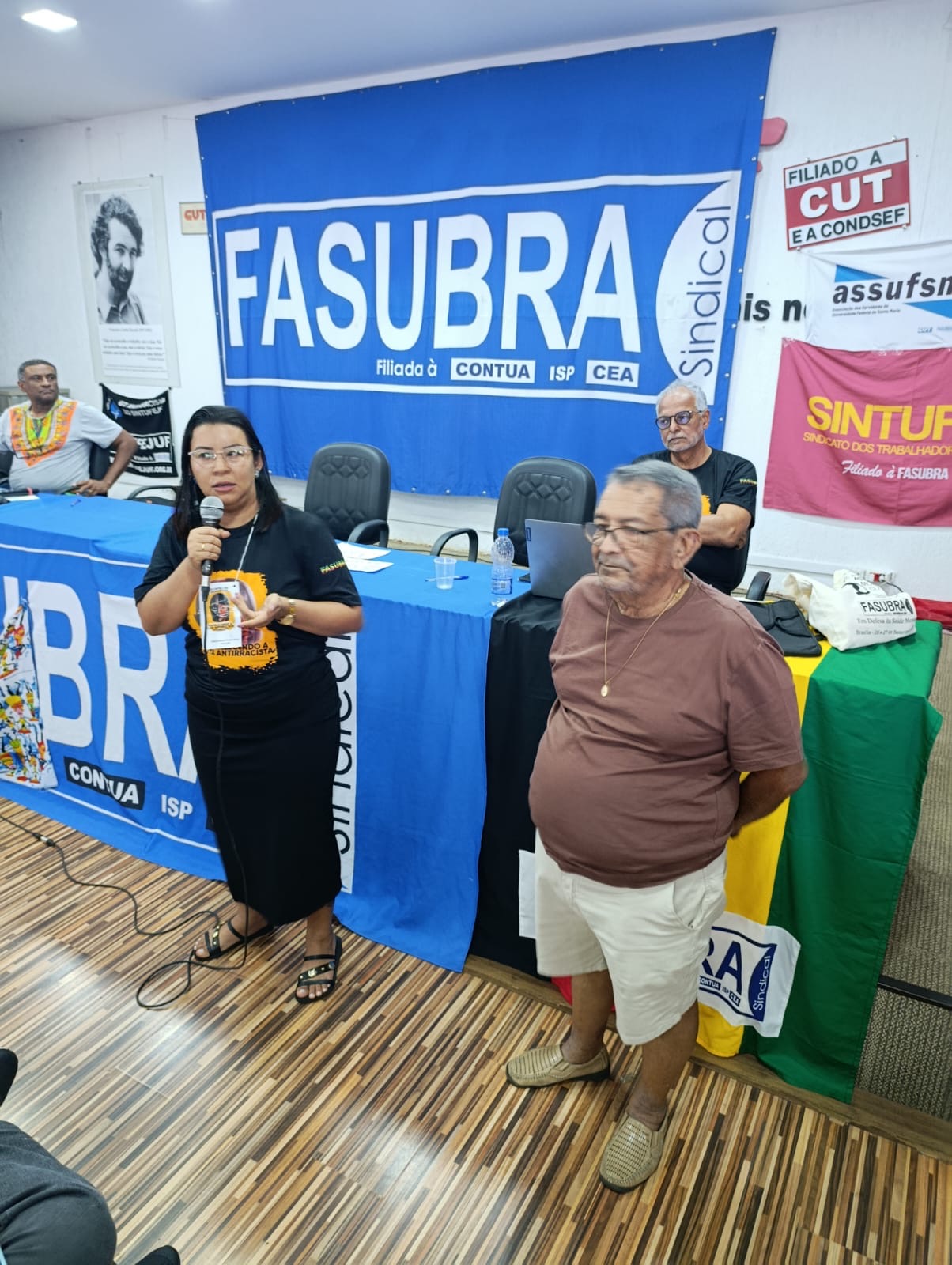 Durante esta terça-feira (25), a Coordenadora Jurídica e de Relações de Trabalho, Jiele Silva, a Coordenadora de Secretaria Jaíne Vasconcellos, o Coordenador de Esporte Cultura e Lazer Paulo Quadrado, a TAE ativa da base Alessandra Alfaro e o TAE Aposentado Antoninho Ezequiel, integrantes do GT Políticas Sociais e Antirracistas da Assufsm participaram da programação da Marcha das Mulheres Negras por Reparação e Bem Viver, que acontece em Brasília.