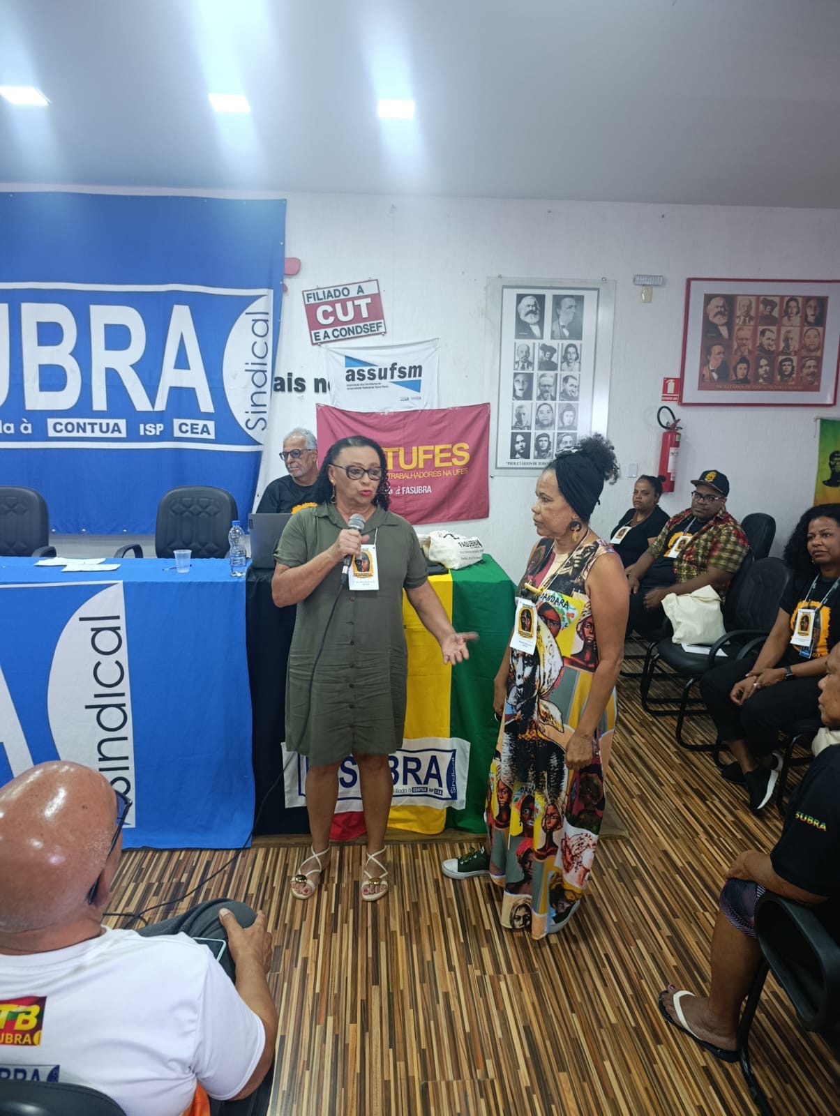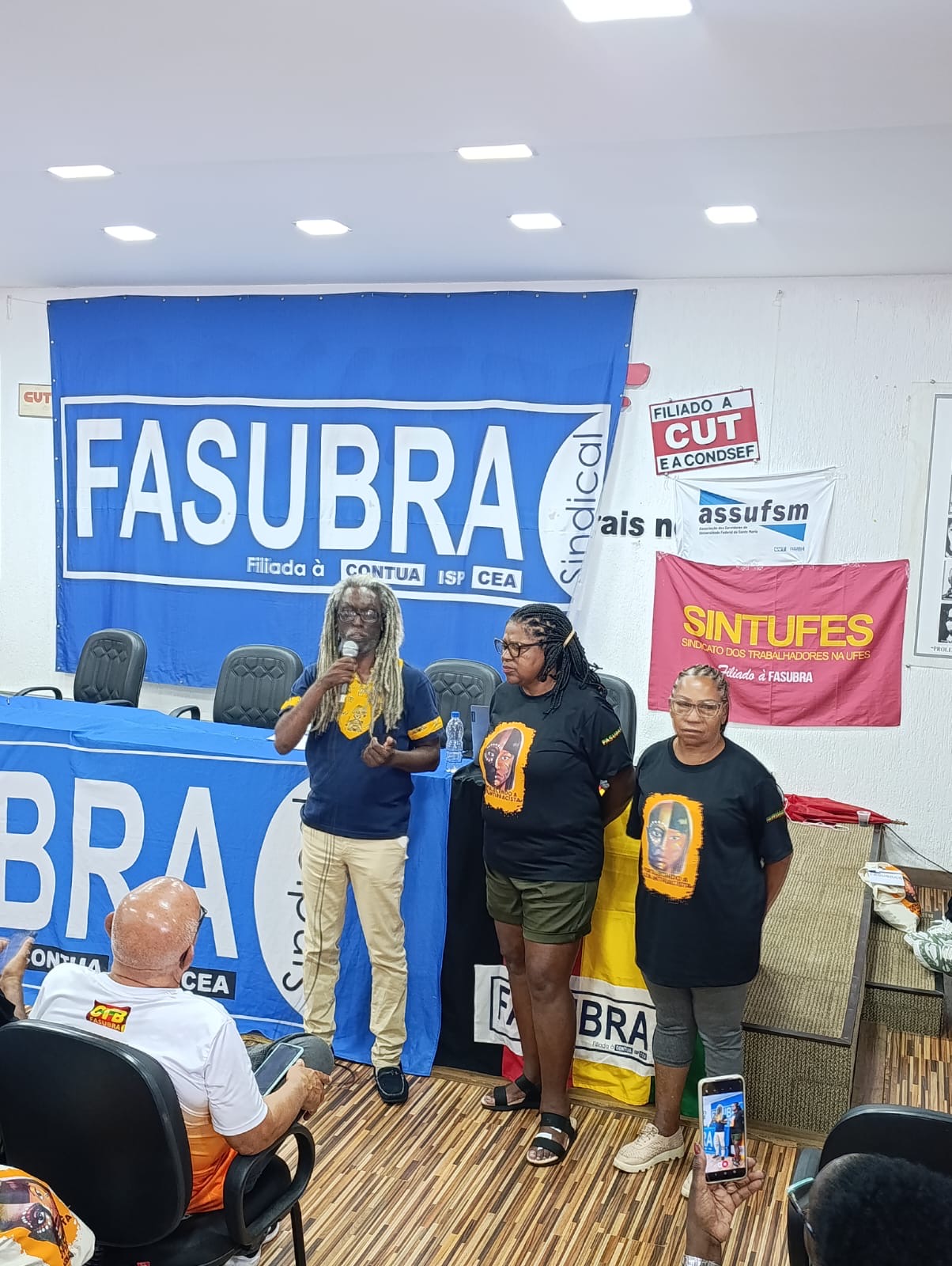 Antes do evento, na segunda-feira (25), as delegadas da Assufsm integraram uma oficina de confecção de turbantes e cartazes utilizados na Marcha, símbolos de resistência, ancestralidade e afirmação das pautas das mulheres negras. O momento foi coordenado pelo GT Mulher Trabalhadora da Fasubra, durante o Encontro de Raça e Etnia da Fasubra, que reforçou a importância da presença ativa das trabalhadoras na Marcha.