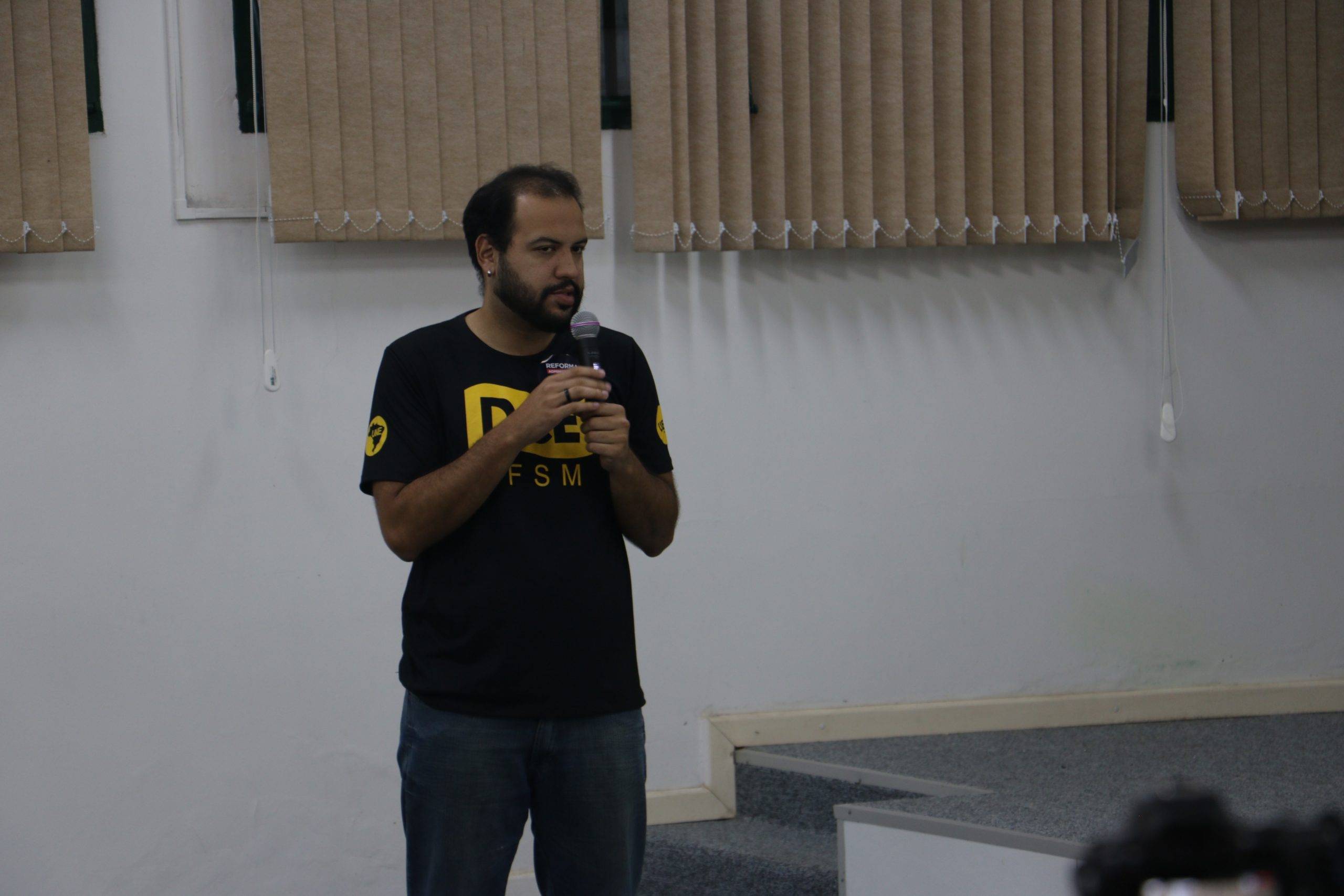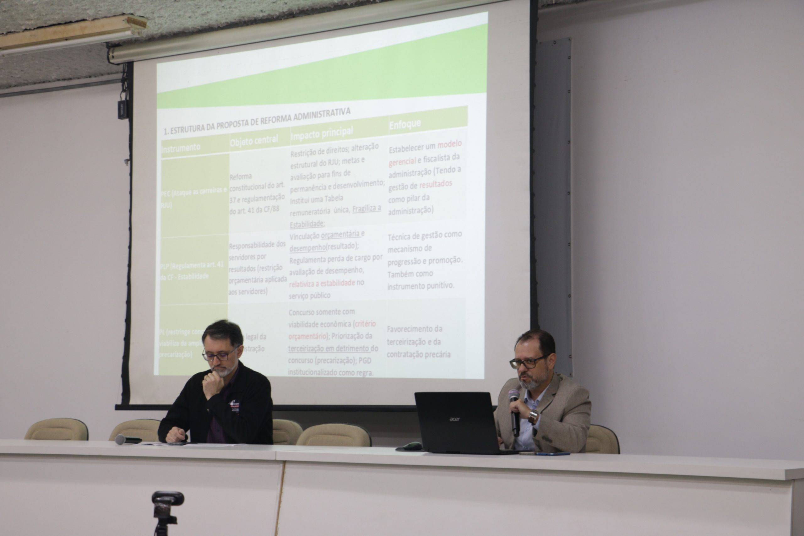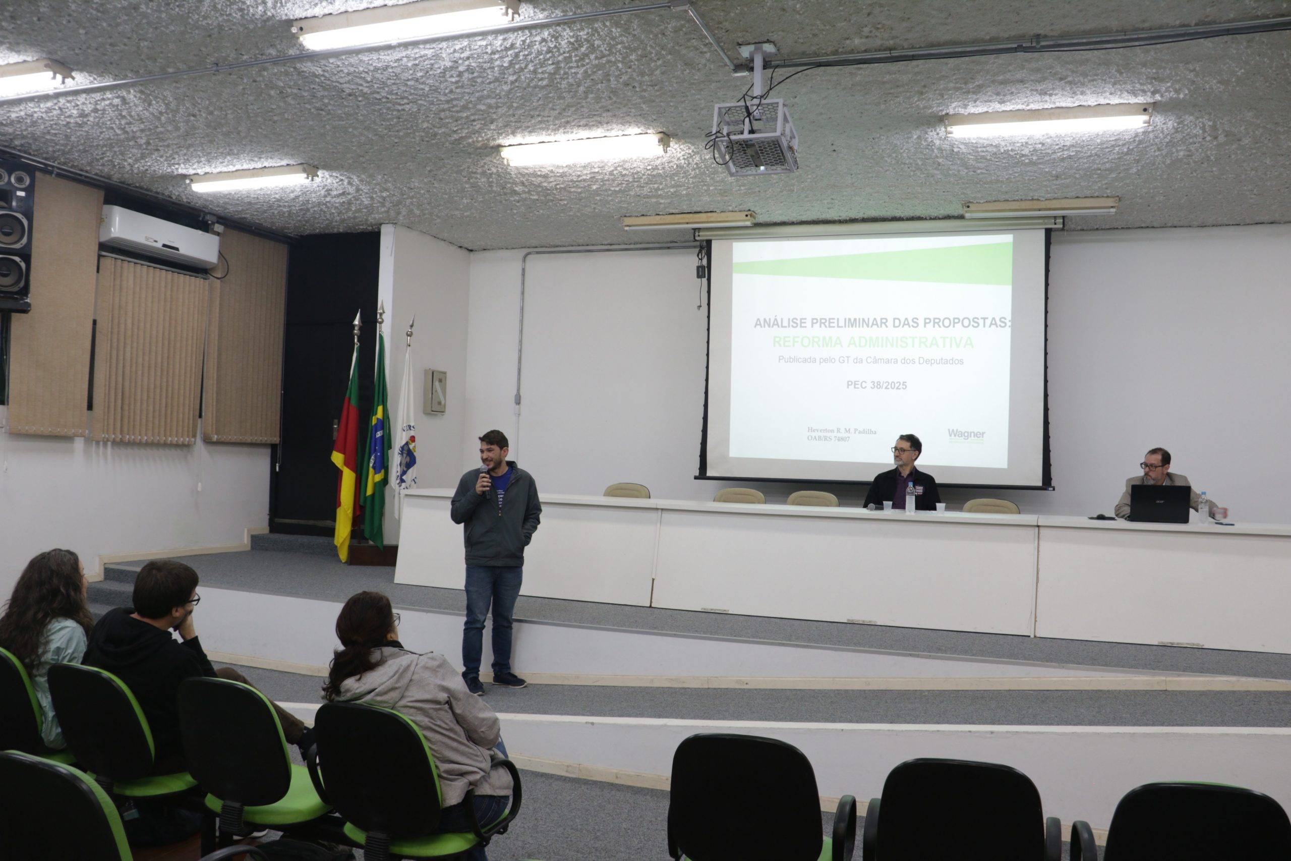 Após a fala do advogado, o professor Everton Picolotto, dirigente da Sedufsm, abordou a situação específica dos docentes, destacando o impacto financeiro e manifestando preocupação com a possível adoção de avaliações por resultado e com o risco de extinção dos concursos públicos, em razão do aumento nas contratações de professores substitutos. Ele questiona qual seria o real interesse dos agentes privados – como a fundação Lehman e a Fecomercio – em reformar o serviço público.