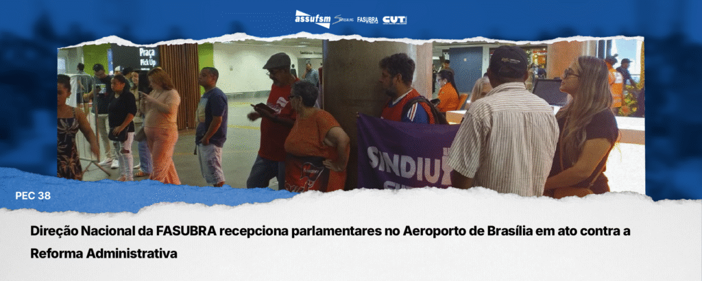 A direção nacional da FASUBRA Sindical marcou presença, na manhã desta terça-feira (18), na área de desembarque do Aeroporto Internacional de Brasília, em mais uma ação de pressão política para barrar a Reforma Administrativa. O ato fez parte da estratégia nacional de entidades do serviço público para dialogar diretamente com parlamentares que desembarcaram na capital federal ao longo do dia.