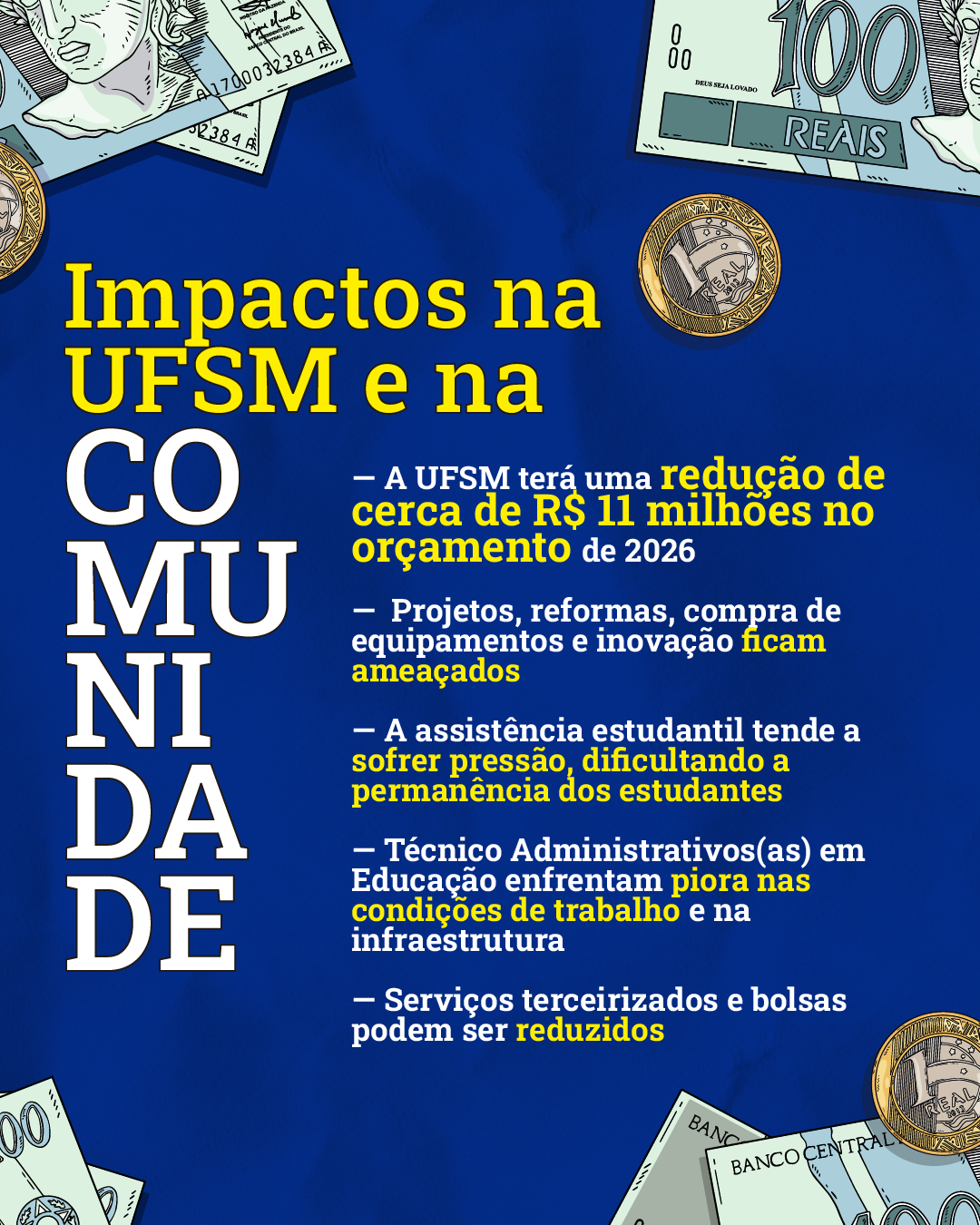 Na Universidade Federal de Santa Maria (UFSM), a redução orçamentária prevista para 2026 representa uma diminuição de aproximadamente R$ 11 milhões no orçamento discricionário. O valor, que inicialmente estava estimado em cerca de R$ 150 milhões, passa para aproximadamente R$ 139 milhões.
