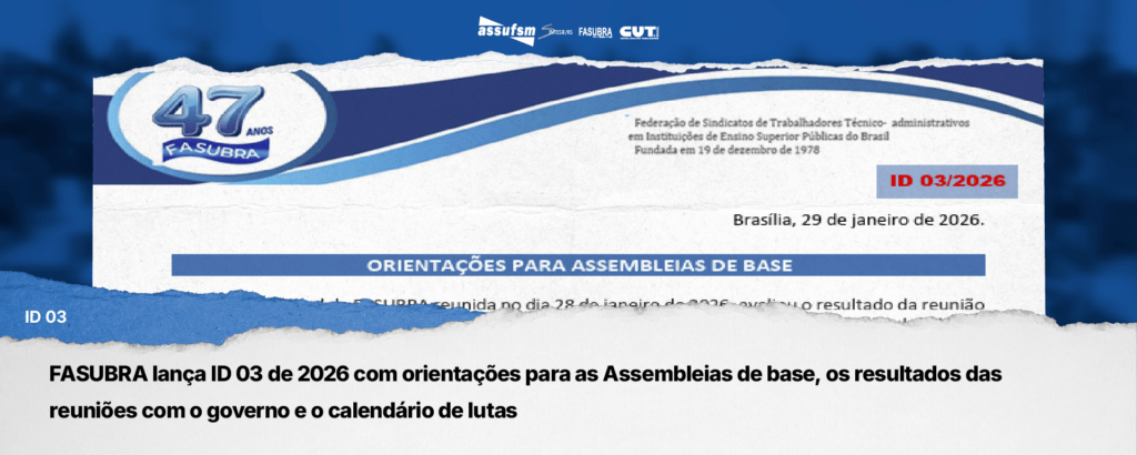 Na quinta-feira (29), a FASUBRA Sindical divulgou o Informe de Direção (ID) nº 03/2026, que reúne os principais informes de interesse da categoria dos Técnico Administrativos(as) em Educação (TAEs). Entre os destaques do documento estão orientações para as rodadas de Assembleia das bases sindicais, os resultados das reuniões com o governo dos dias 16 de dezembro e 27 de janeiro, chamada para a Plenária Nacional Virtual do dia 31 de janeiro, que terá as mesmas delegações da plenária dos dias 24 e 25 de janeiro e o tradicional calendário de lutas de janeiro, fevereiro e março.