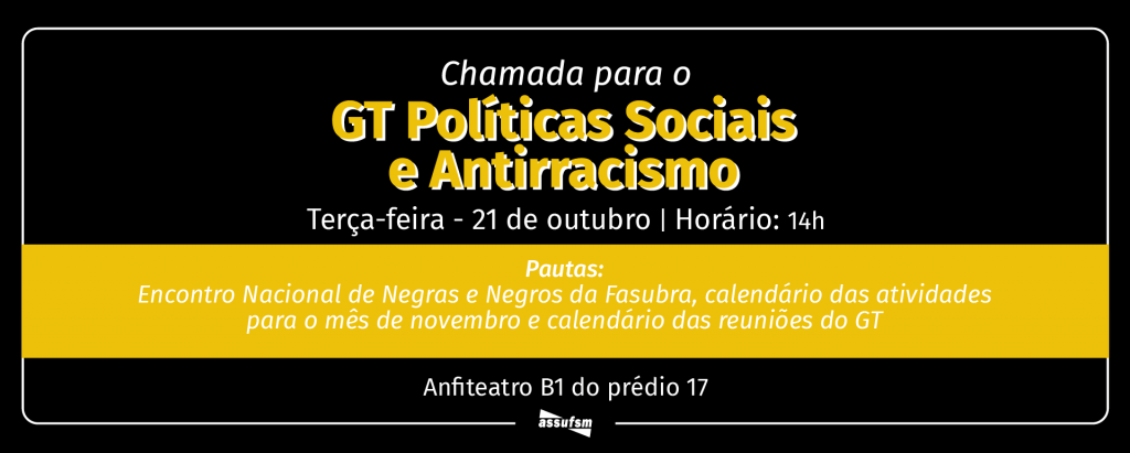 📢 O GT Políticas Sociais e Antirracismo realizará reunião no dia 21 de outubro, às 14h, no Anfiteatro B1 do Prédio 17.