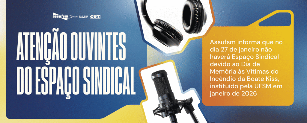 Atenção ouvintes do Espaço Sindical da Assufsm, no dia 27 de janeiro, não haverá programa de rádio, na 800AM, da Rádio Universidade, devido ao Dia de Memória às Vítimas do Incêndio da Boate Kiss, instituído pela UFSM em janeiro de 2026.