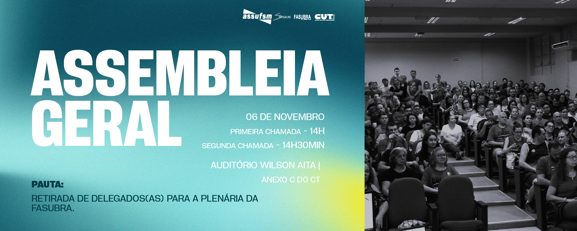 📢 A Assufsm chama a categoria para participar de Assembleia Geral, na quinta-feira, dia 06 de novembro, com primeira chamada às 14h, e segunda chamada às 14h30min,