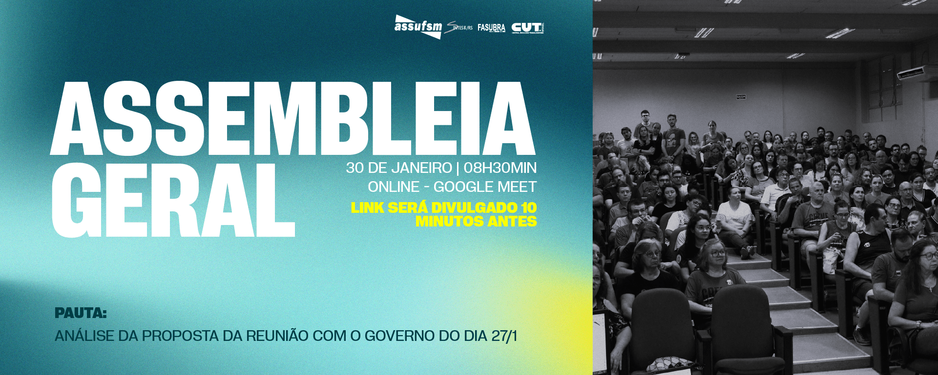 📢 A Assufsm chama a categoria para participar de Assembleia Geral, na sexta-feira, dia 30 de janeiro, às 8h30min, pelo Google Meet (com divulgação do link 10min antes do