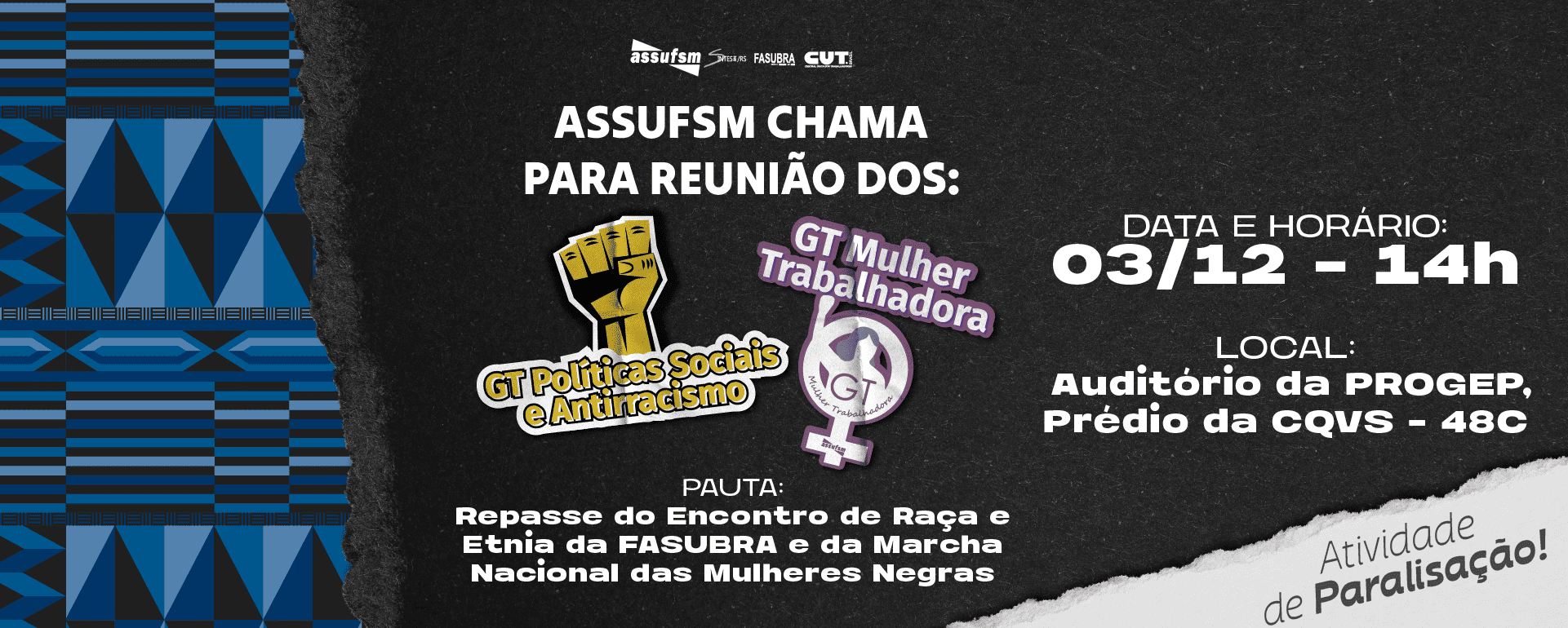 No dia 03 de dezembro, às 14h, no Auditório da PROGEP, no Prédio da CQVS – 48C, o GT Políticas Sociais e Antirracista e o