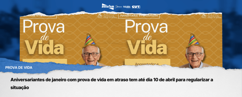 Para evitar a suspensão do pagamento deve ser realizada a comprovação de vida até o dia 10 de abril de 2026, mediante comparecimento pessoal do interessado à agência bancária ou à Pró-Reitoria de Gestão de Pessoas da UFSM, portando Cadastro de Pessoa Física (CPF) e documento oficial de identificação com foto ou por meio da Prova de Vida Digital (aplicativos SouGov.br e Gov.br).