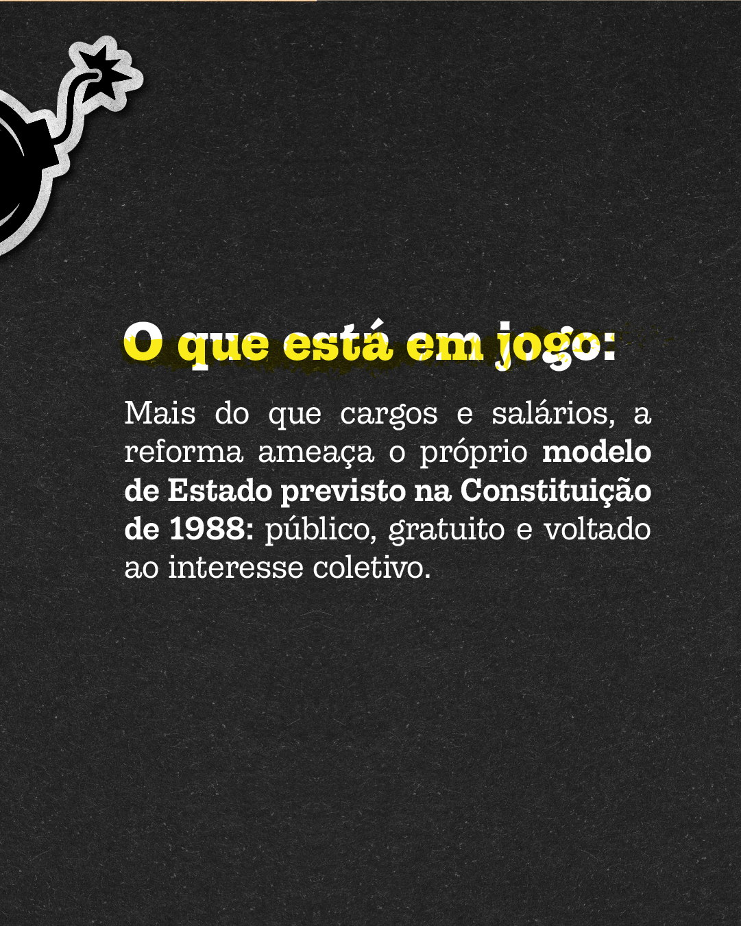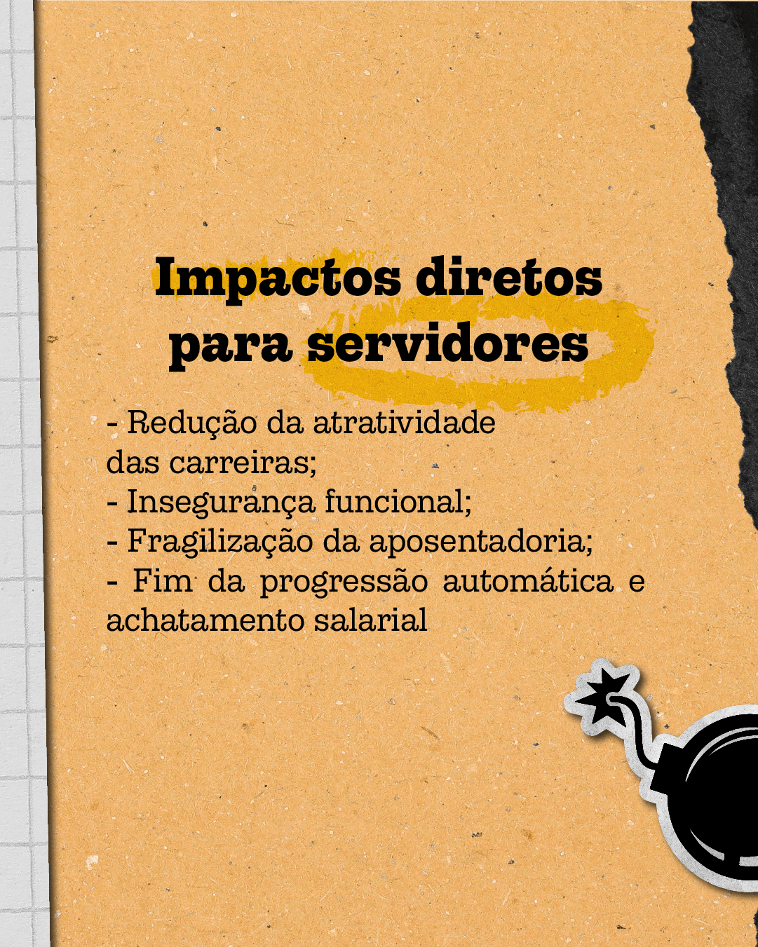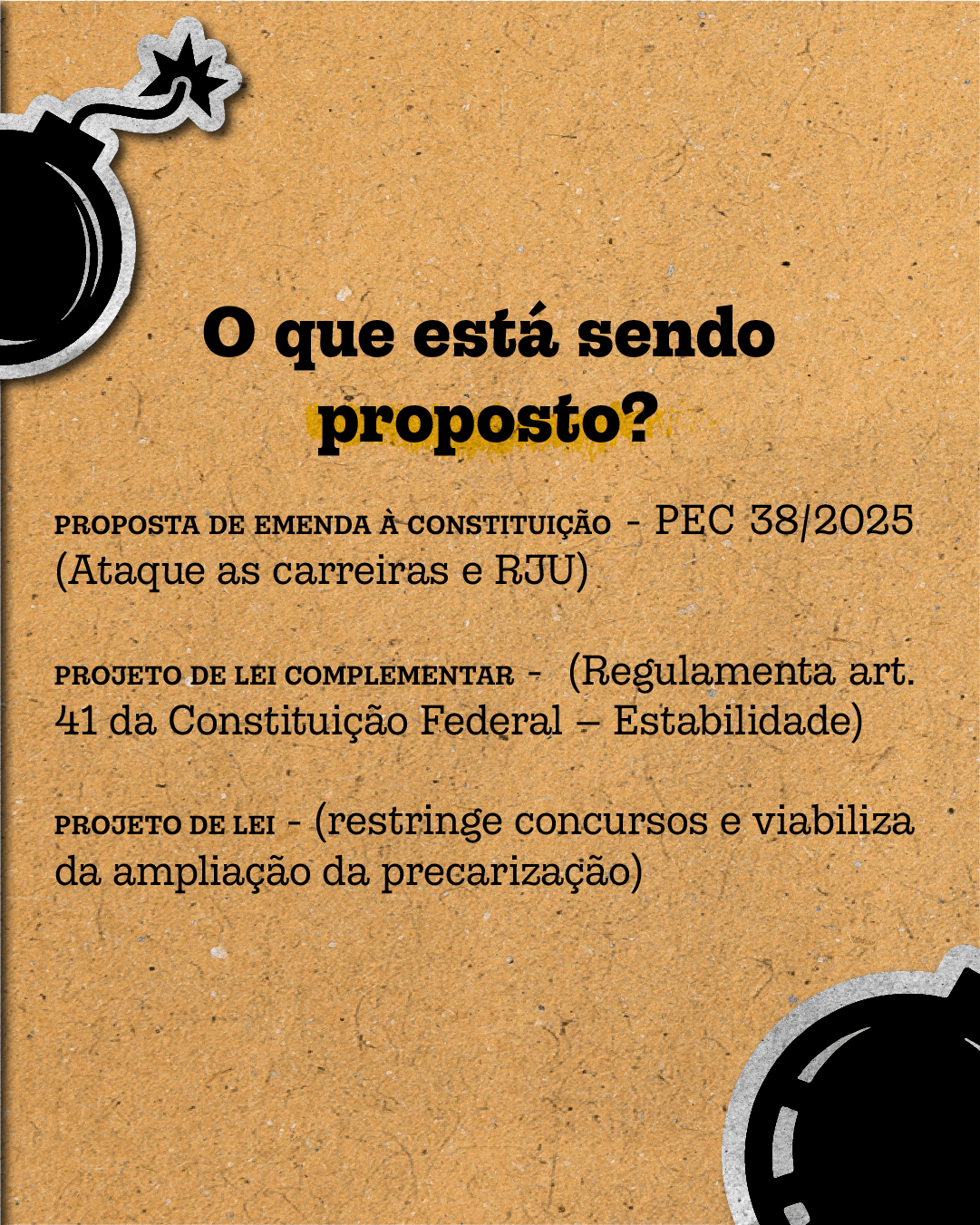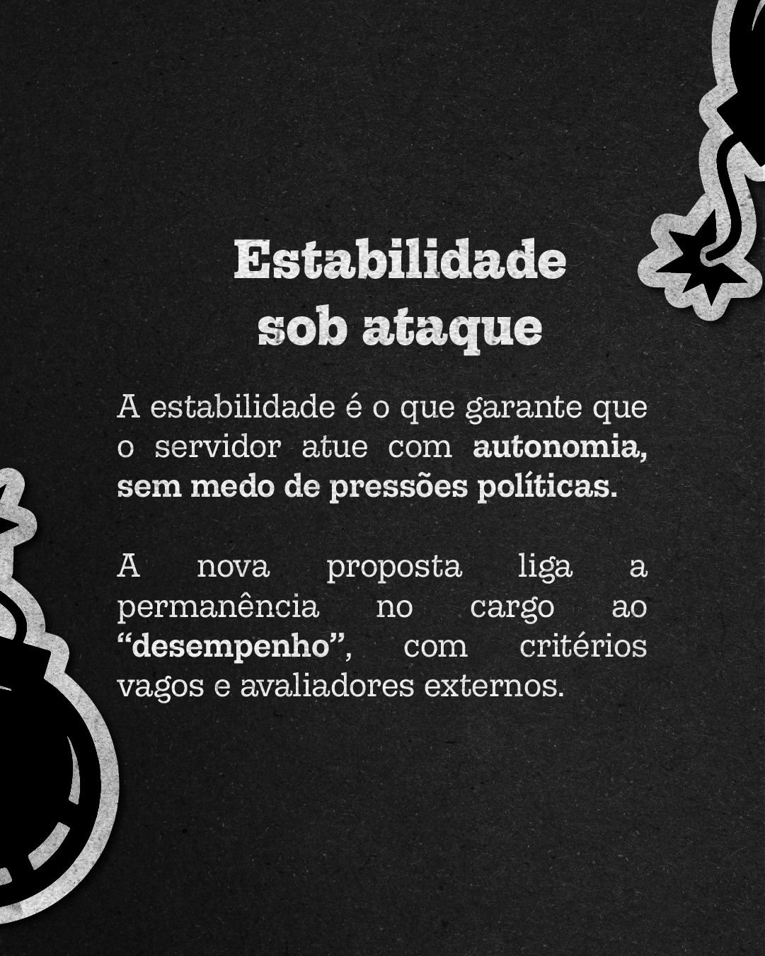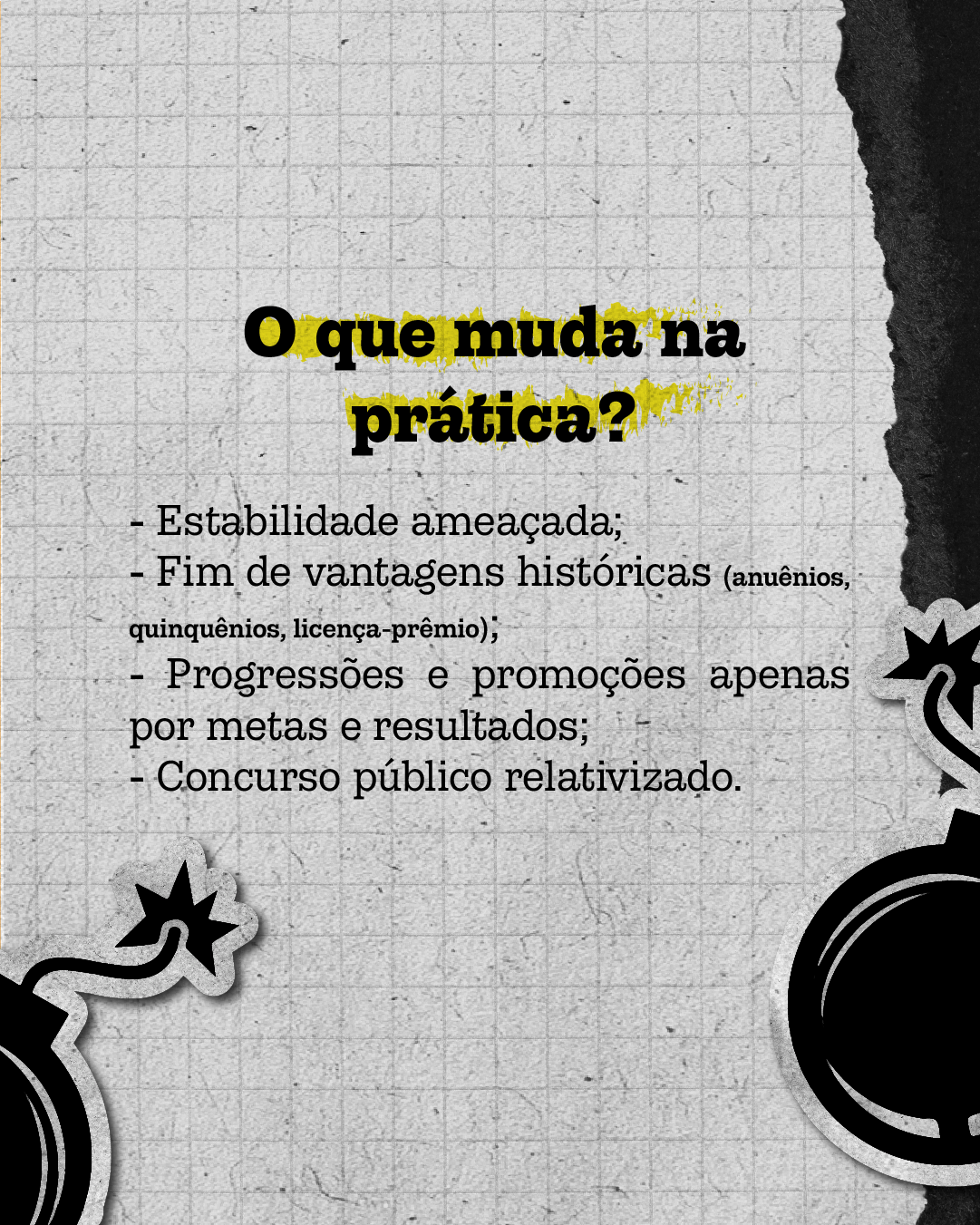 Pontos como a estabilidade, fim de vantagens históricas, progressões e promoções apenas por metas e resultados e concursos públicos relativizados são algumas das ameaças da PEC 38. Confira, abaixo, as principais propostas da Reforma que visa acabar com o serviço público: