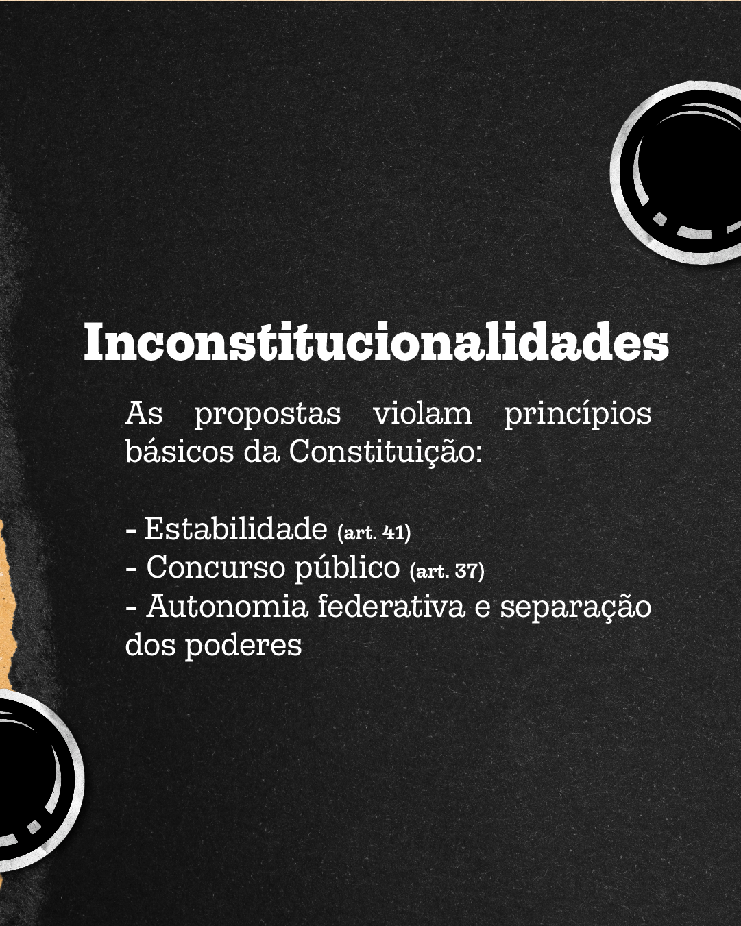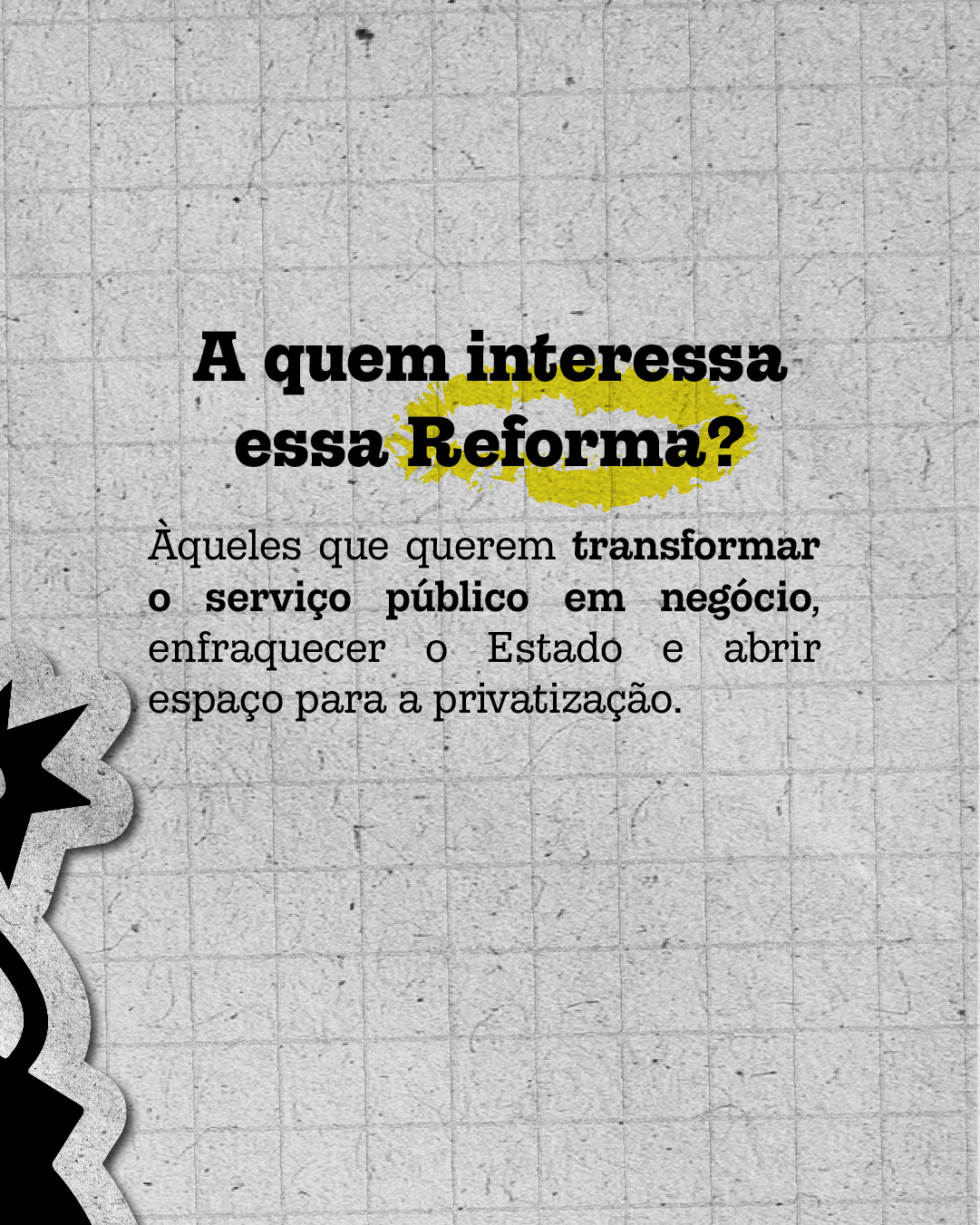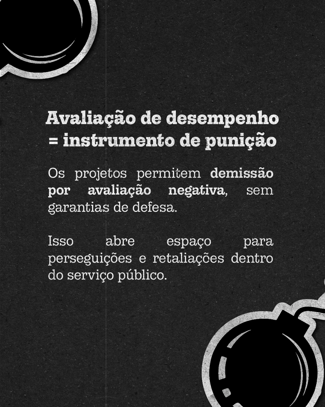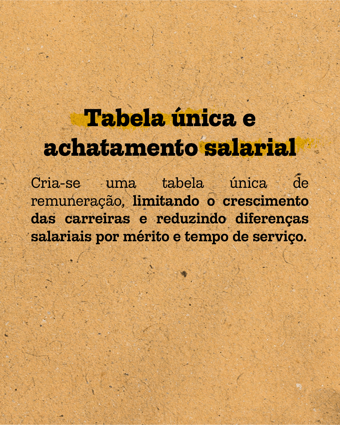Pontos como a estabilidade, fim de vantagens históricas, progressões e promoções apenas por metas e resultados e concursos públicos relativizados são algumas das ameaças da PEC 38. Confira, abaixo, as principais propostas da Reforma que visa acabar com o serviço público: