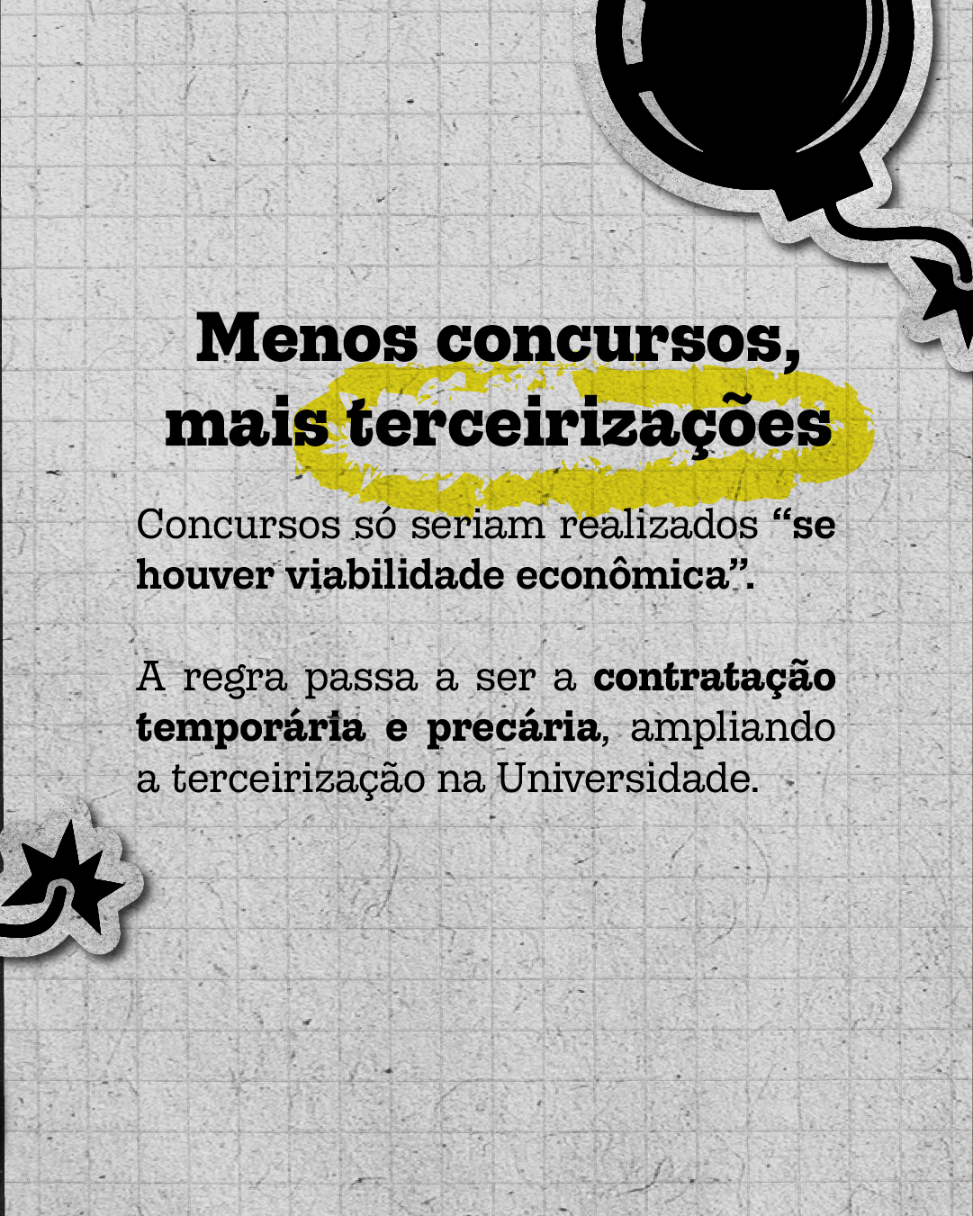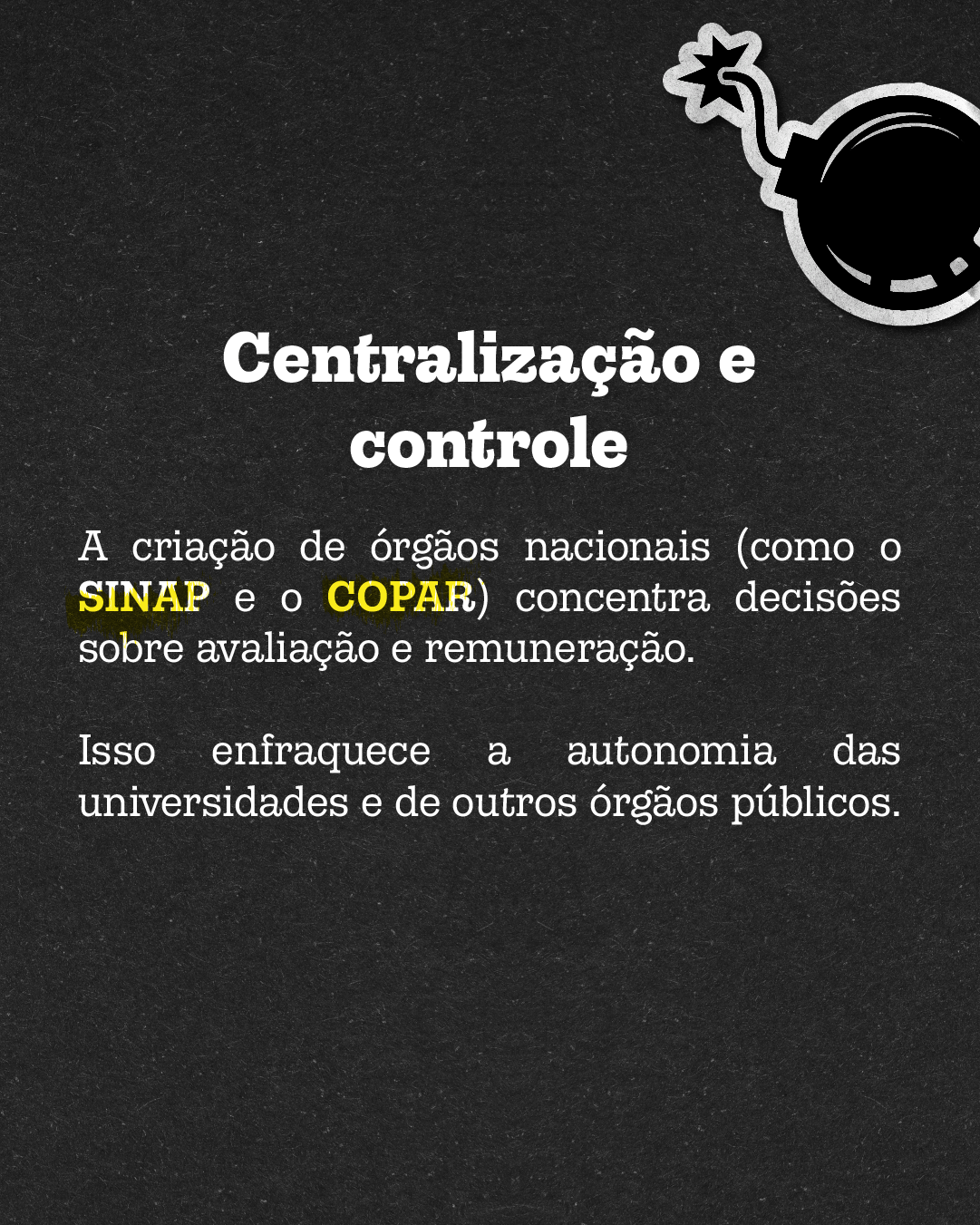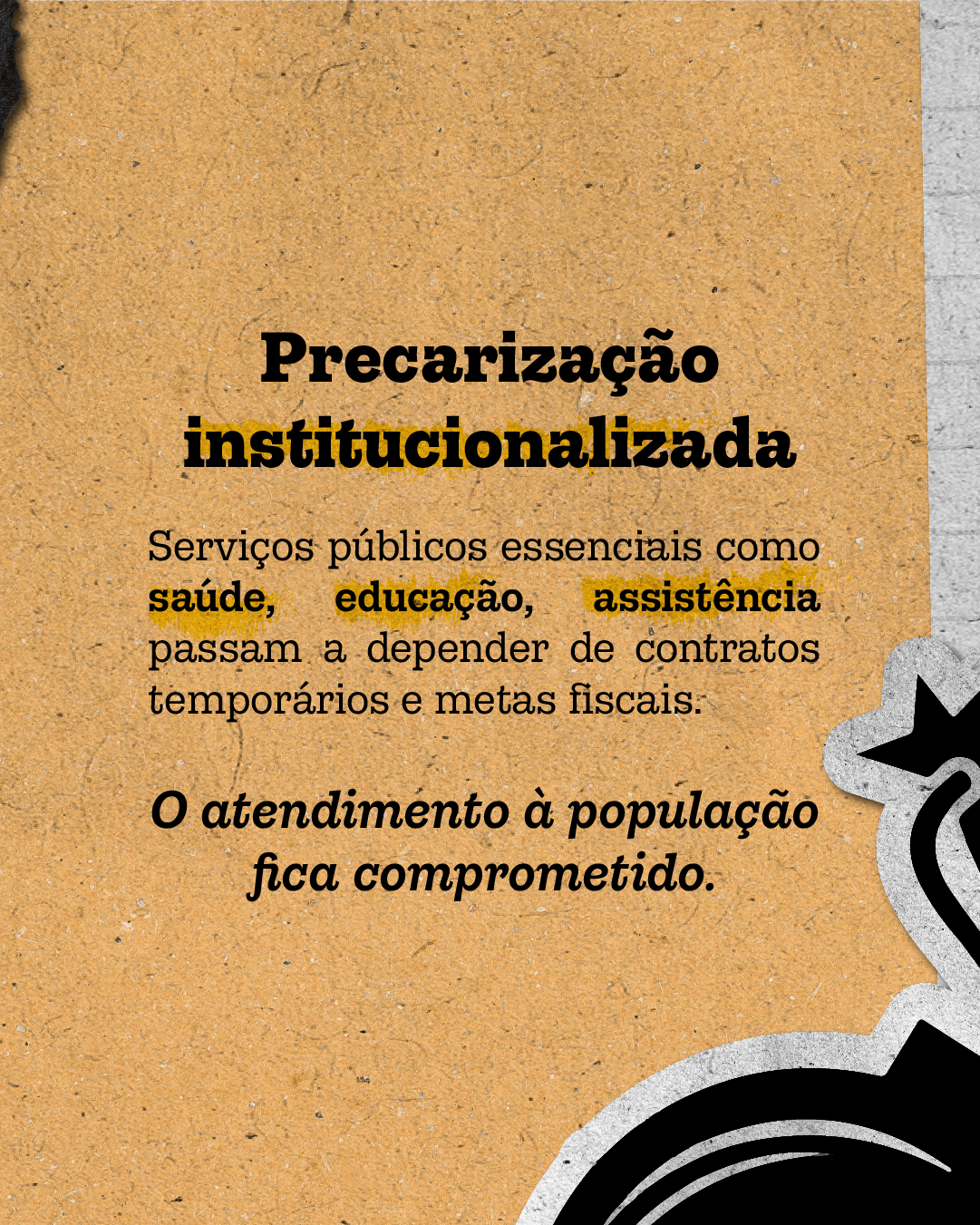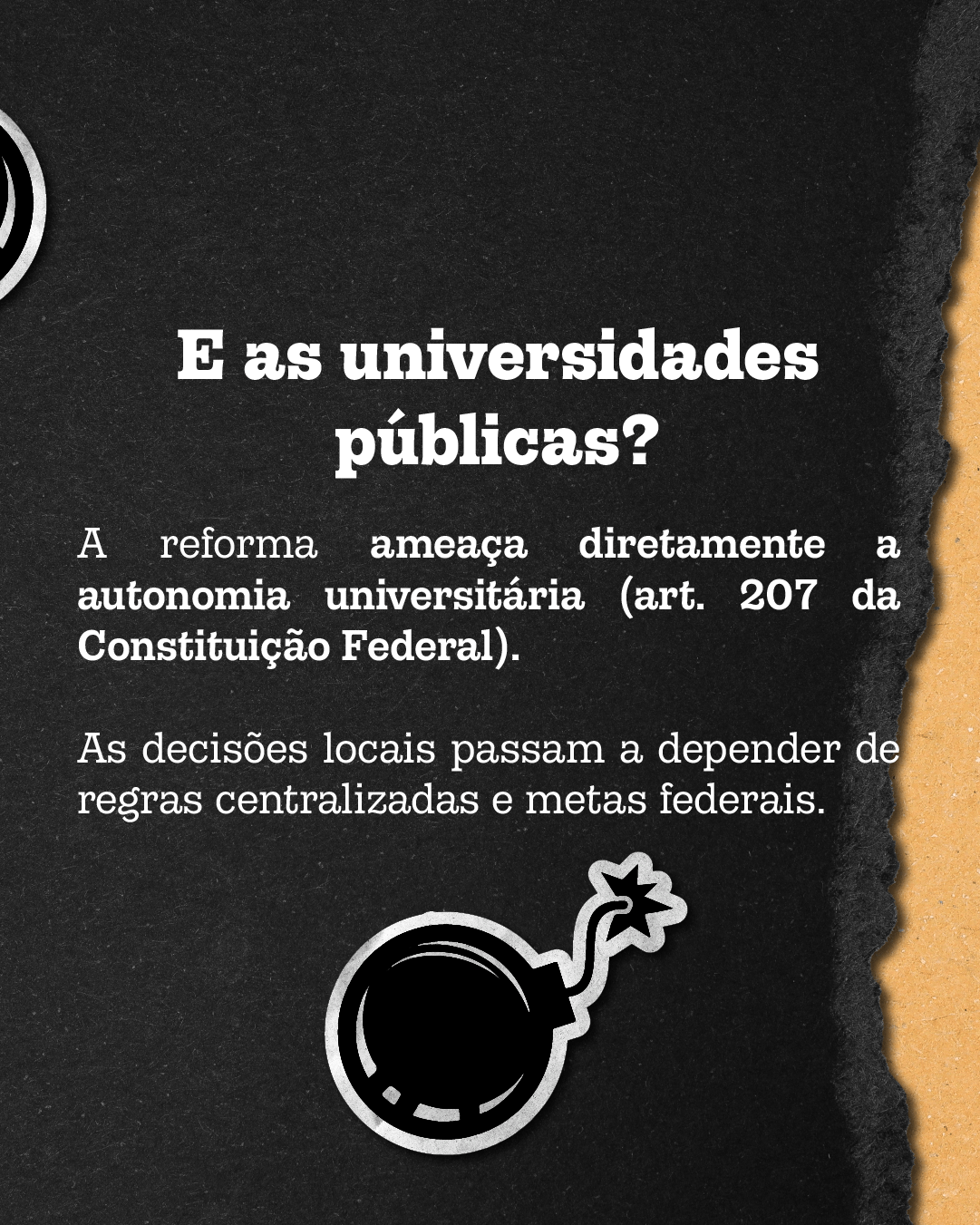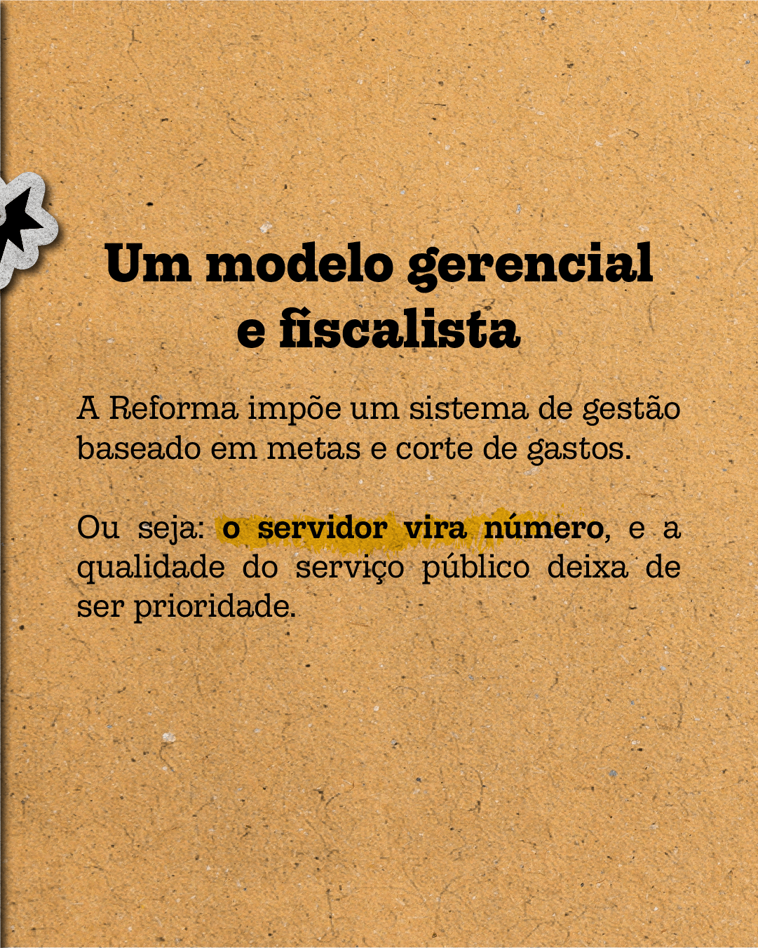 Pontos como a estabilidade, fim de vantagens históricas, progressões e promoções apenas por metas e resultados e concursos públicos relativizados são algumas das ameaças da PEC 38. Confira, abaixo, as principais propostas da Reforma que visa acabar com o serviço público: