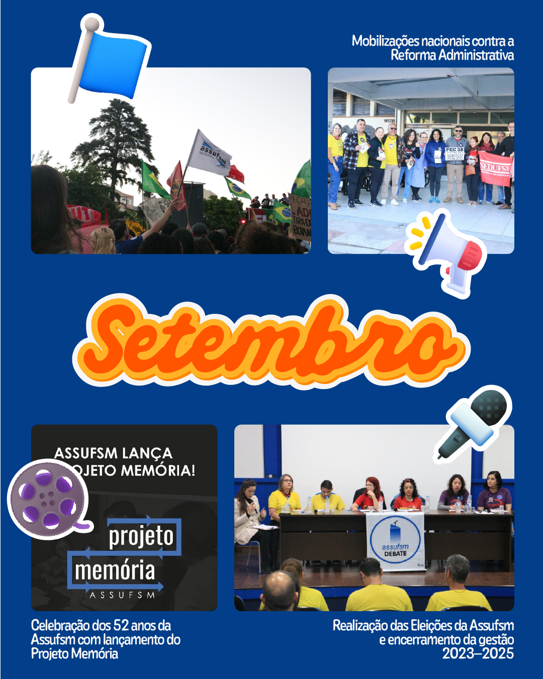 Por fim, o mês foi de celebração e memória, com o aniversário de 52 anos da Assufsm e o lançamento do Projeto Memória, iniciativa que busca resgatar e preservar a trajetória de lutas, conquistas e histórias que constroem a identidade do sindicato, fortalecendo o passado para inspirar o futuro.