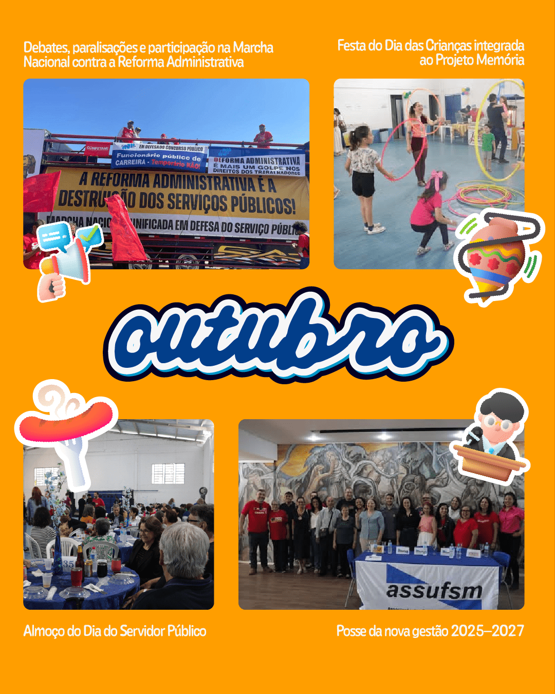 Outubro também foi marcado por momentos de integração, memória e convivência. A tradicional Festa do Dia das Crianças reuniu famílias na Sede Campestre e foi integrada ao Projeto Memória, fortalecendo os laços intergeracionais. Em alusão ao Dia do Servidor Público, a Assufsm promoveu um almoço dançante, celebrando a categoria, a coletividade e a importância da organização sindical.