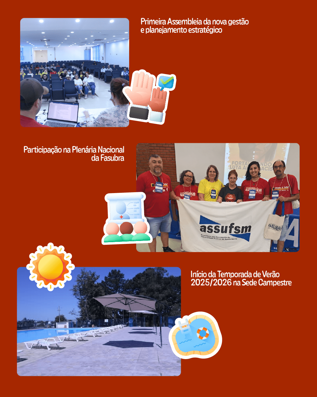 Além da atuação sindical, a temporada de verão seguiu com intensa programação na sede campestre da Assufsm, promovendo lazer, integração e cultura. Em fevereiro, foi instalado o novo pórtico de entrada da sede, reforçando a identidade do sindicato e o slogan “juntos somos mais fortes”.