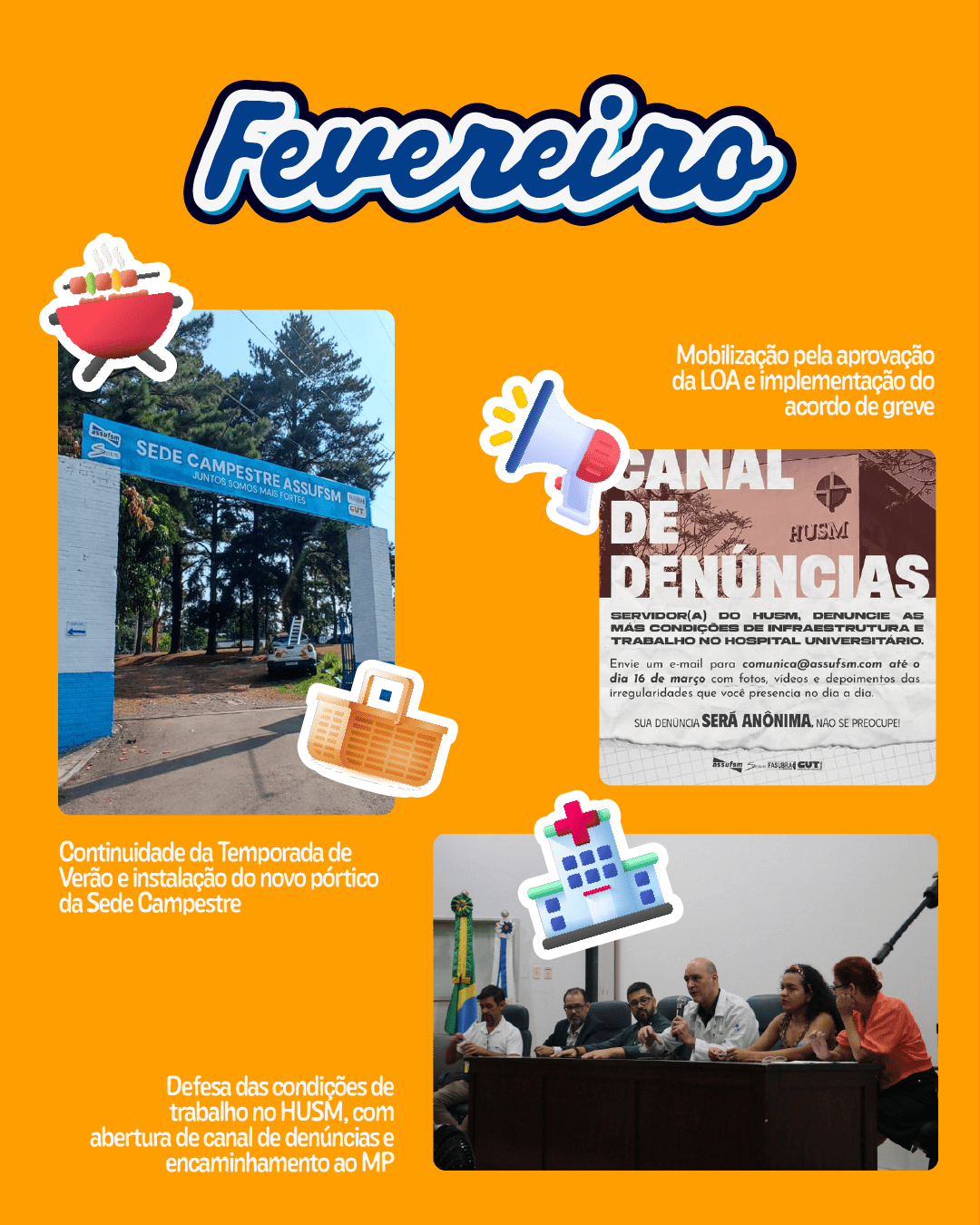Em fevereiro, a Assufsm reforçou sua atuação na defesa das condições de trabalho no Hospital Universitário de Santa Maria (HUSM) com a abertura de um canal de denúncias sobre a precarização da infraestrutura e do ambiente laboral. A iniciativa garantiu anonimato aos servidores(as) e teve como objetivo reunir material para encaminhamentos jurídicos e institucionais. As denúncias foram, posteriormente, encaminhadas ao Ministério Público.