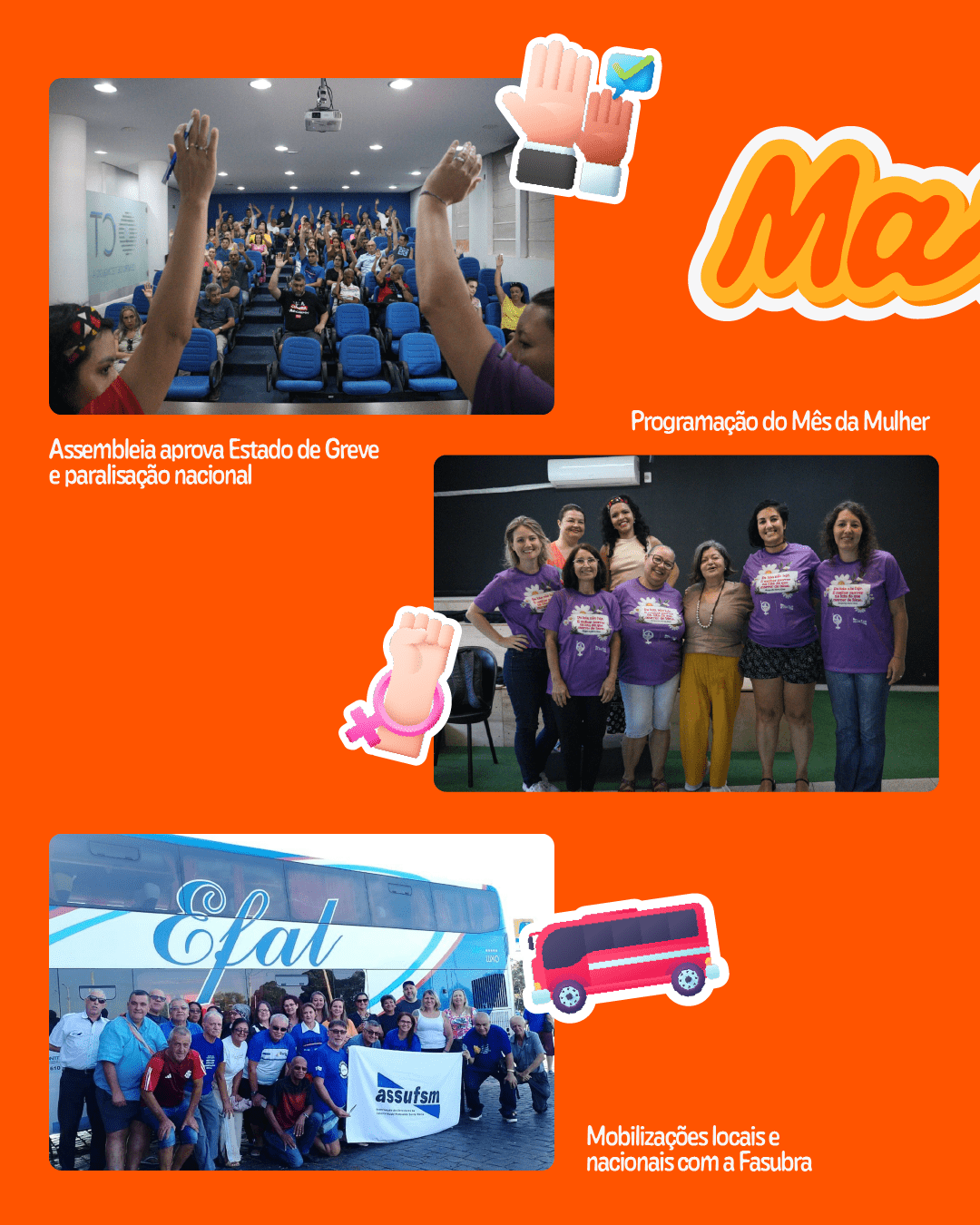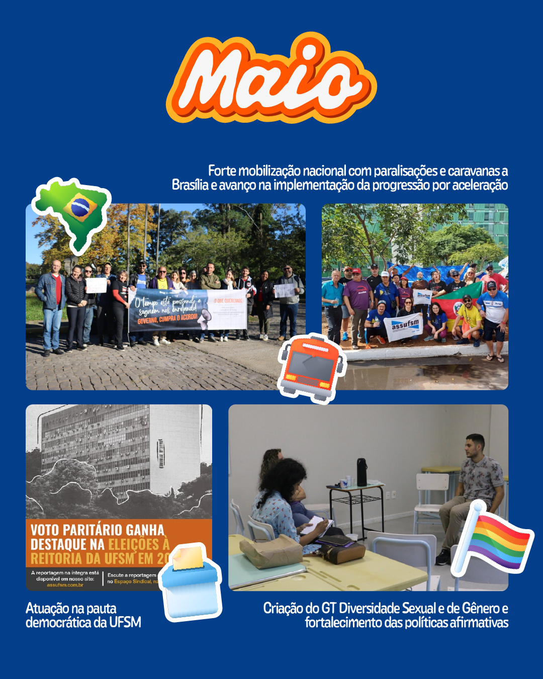 Maio foi marcado por forte mobilização nacional da categoria TAE, com paralisações, caravanas a Brasília e acompanhamento das negociações entre a Fasubra e o Governo Federal pelo cumprimento integral do Acordo de Greve. A Assufsm esteve presente em atos em frente ao MGI e promoveu paralisações na UFSM, com panfletagens, bandeiraços e reuniões nos setores.