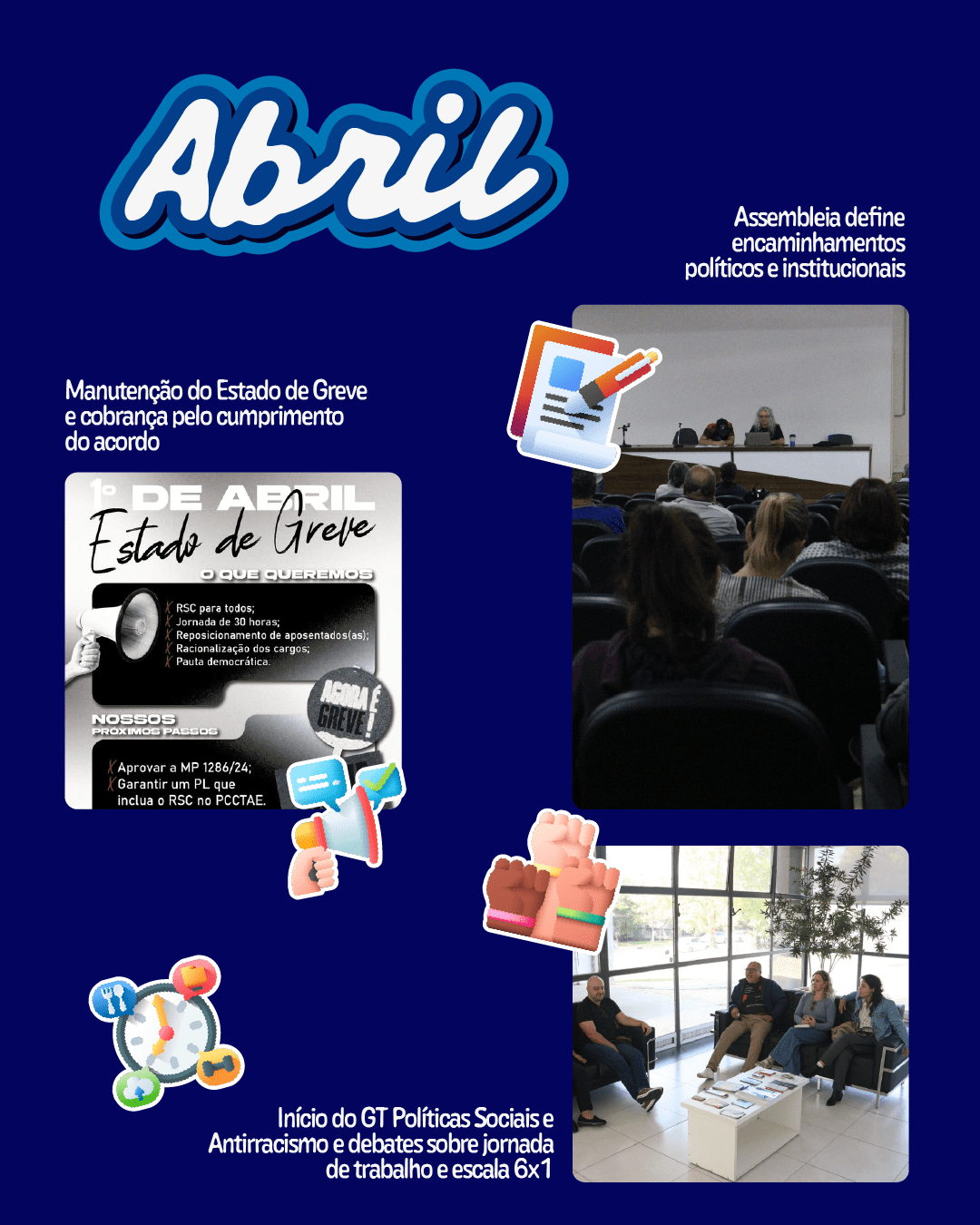Abril iniciou com o Estado de Greve da categoria TAE, a partir de 1º de abril, conforme orientação da Fasubra, em resposta ao não cumprimento integral do Acordo de Greve de 2024. A Assufsm seguiu mobilizada na cobrança por pautas como RSC para todos(as), jornada de 30 horas, reposicionamento de aposentados(as), racionalização dos cargos e pauta democrática.