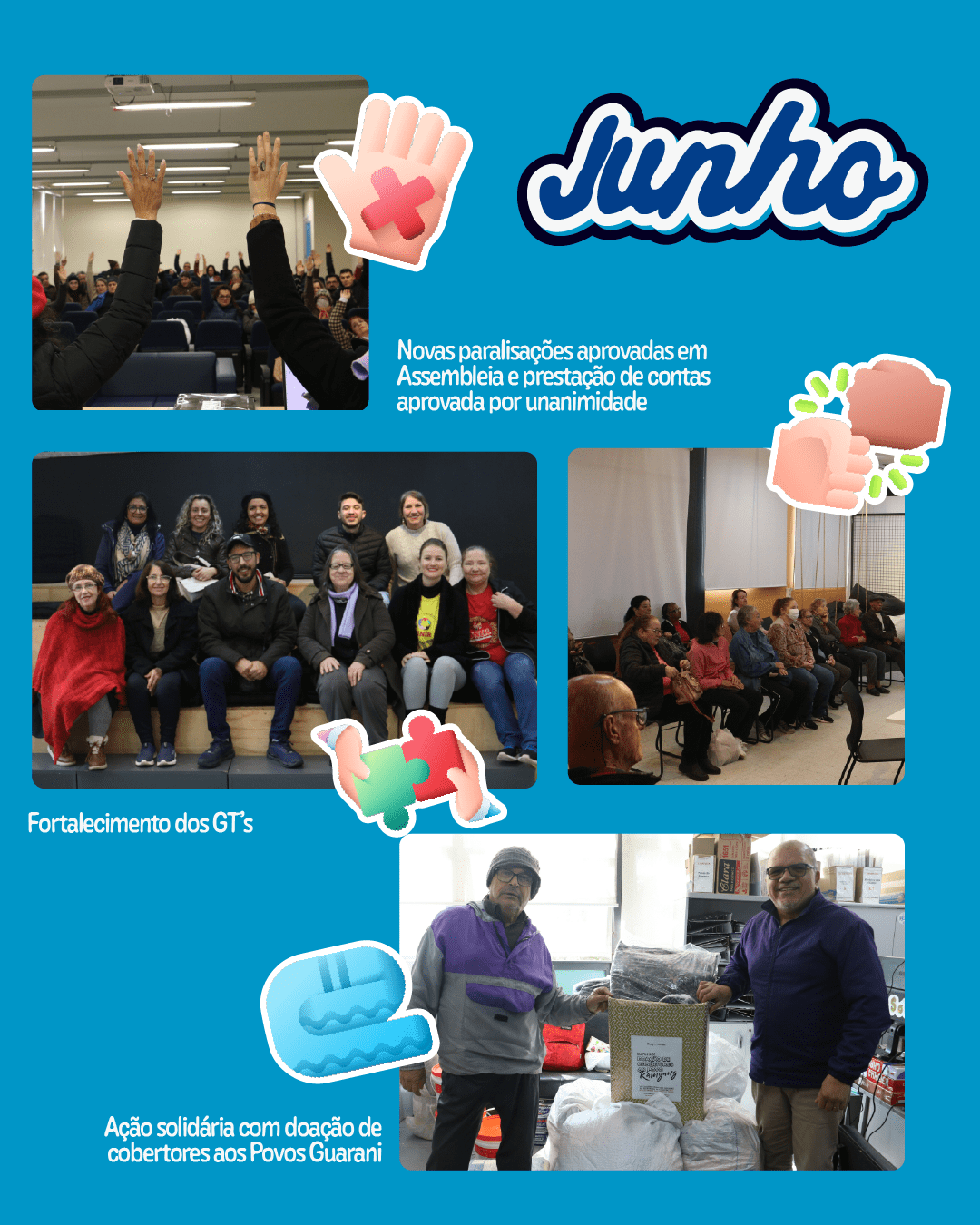 Junho também foi marcado por ações solidárias, com a arrecadação e recebimento de cobertores destinados aos Povos Guarani, reafirmando o compromisso da Assufsm com a solidariedade e a responsabilidade social.