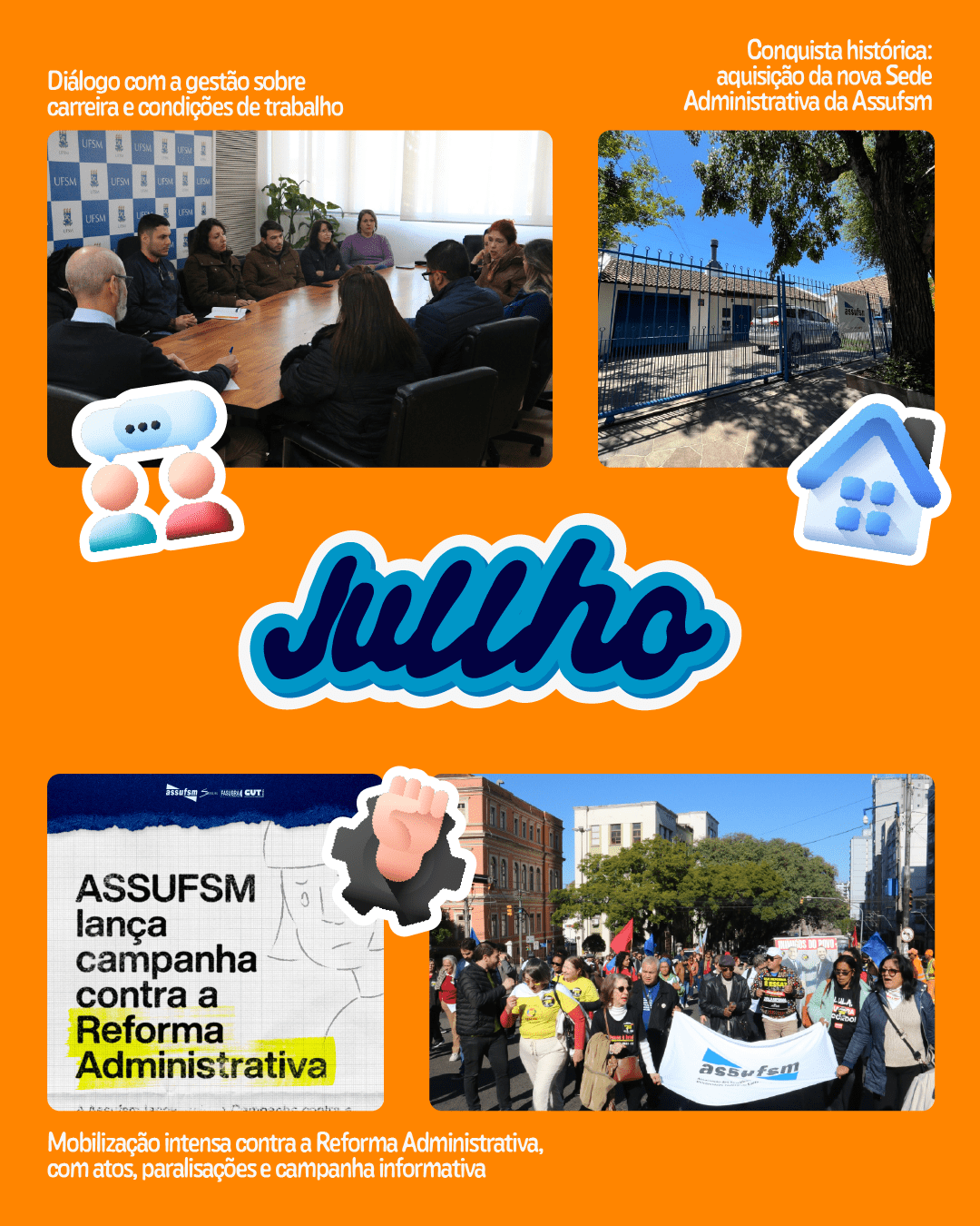 Julho também marcou uma conquista histórica para o sindicato, com a aquisição da nova Sede Administrativa da Assufsm em Camobi, fortalecendo a estrutura da entidade e atendendo a uma demanda antiga da categoria.